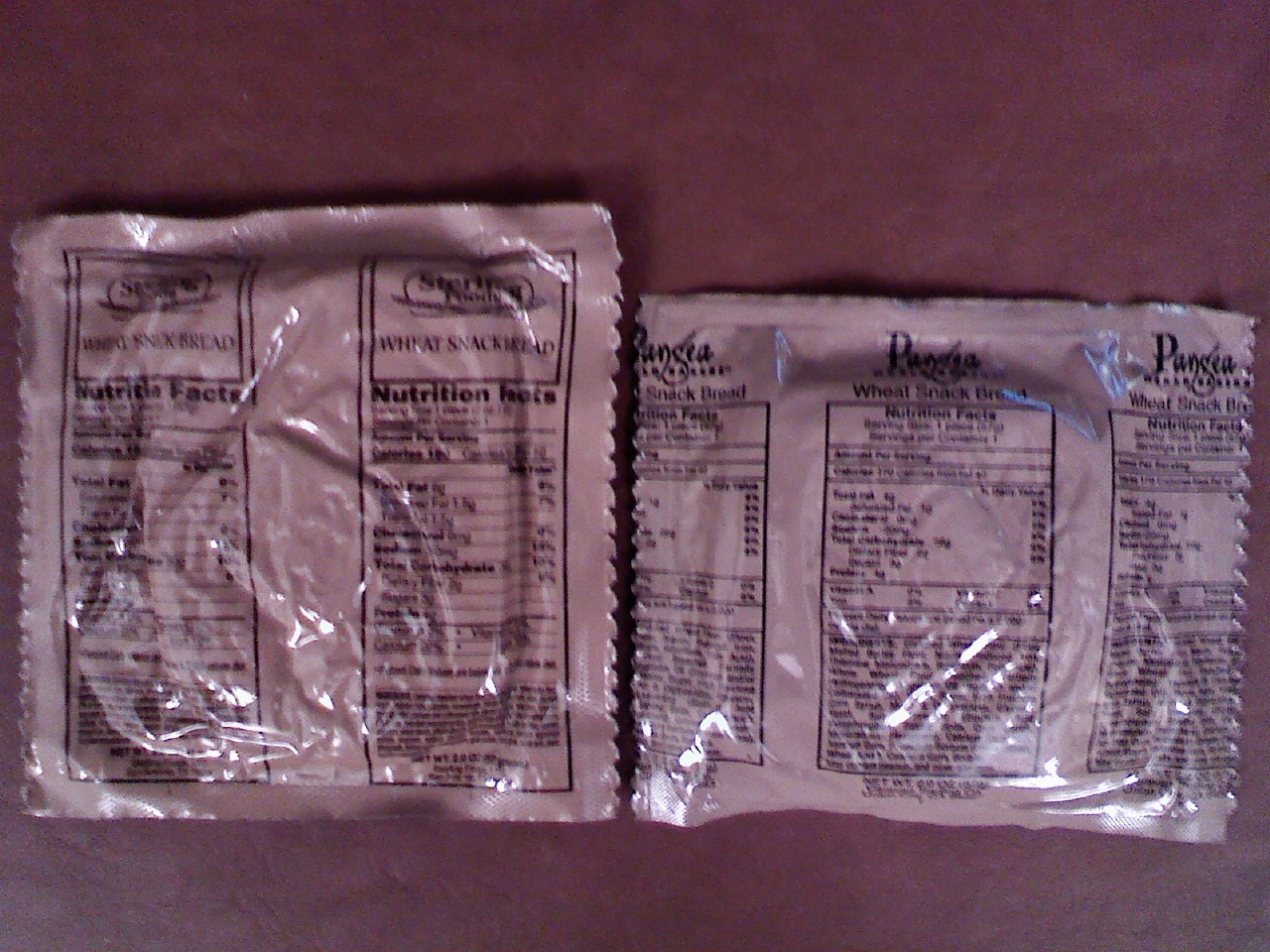 Time for a WSB smackdown...a head-to-head comparison. WSB for those new to the forums stands for Wheat Snack Bread, which in my opinion, is one of the best things you can get in an MRE. I actually got a bunch of these from forum member Treesuit. Sometimes the MRE gods are kind and shove two of the tasty little morsels in the same MRE (i.e. veggie burger, pork rib, sloppy joe, etc.) pouch. I took the following pics with my phone, so I know they're a little grainy. Up for consideration are the following WSB's: