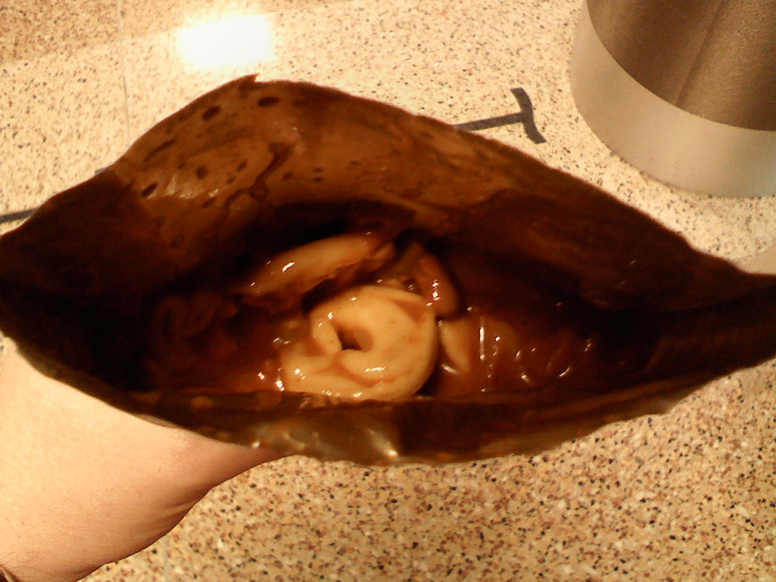 Upon opening the foil pouch, i was greeted with a rather pungent aroma. At first I was afraid it had gone bad. When I sniffed again I realized it was the aroma of all the spices I was smelling. It was like walking into an Indian restraunt! After figuring out the aroma the next thing I noticed was how little was in the bag. The contents were maybe less than half of the bag.