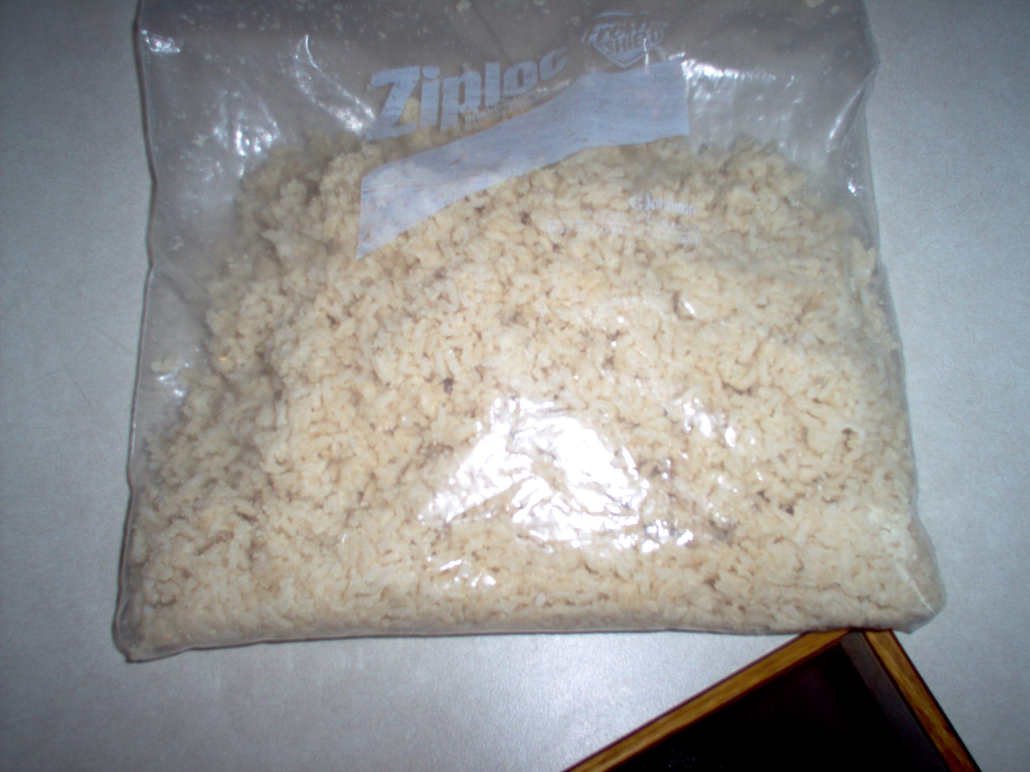 Chop off part of the brick and place in a zip lock back and work and break lose, and bring out the wok or fry pan, go easy on oil and any liquid base that require water, this made a not to bad fried rice deal with some additions! The other option is this would perfect for making a rice pudding! Or you could always use the trays for leveling buildings like the cabin, shed, gargage.