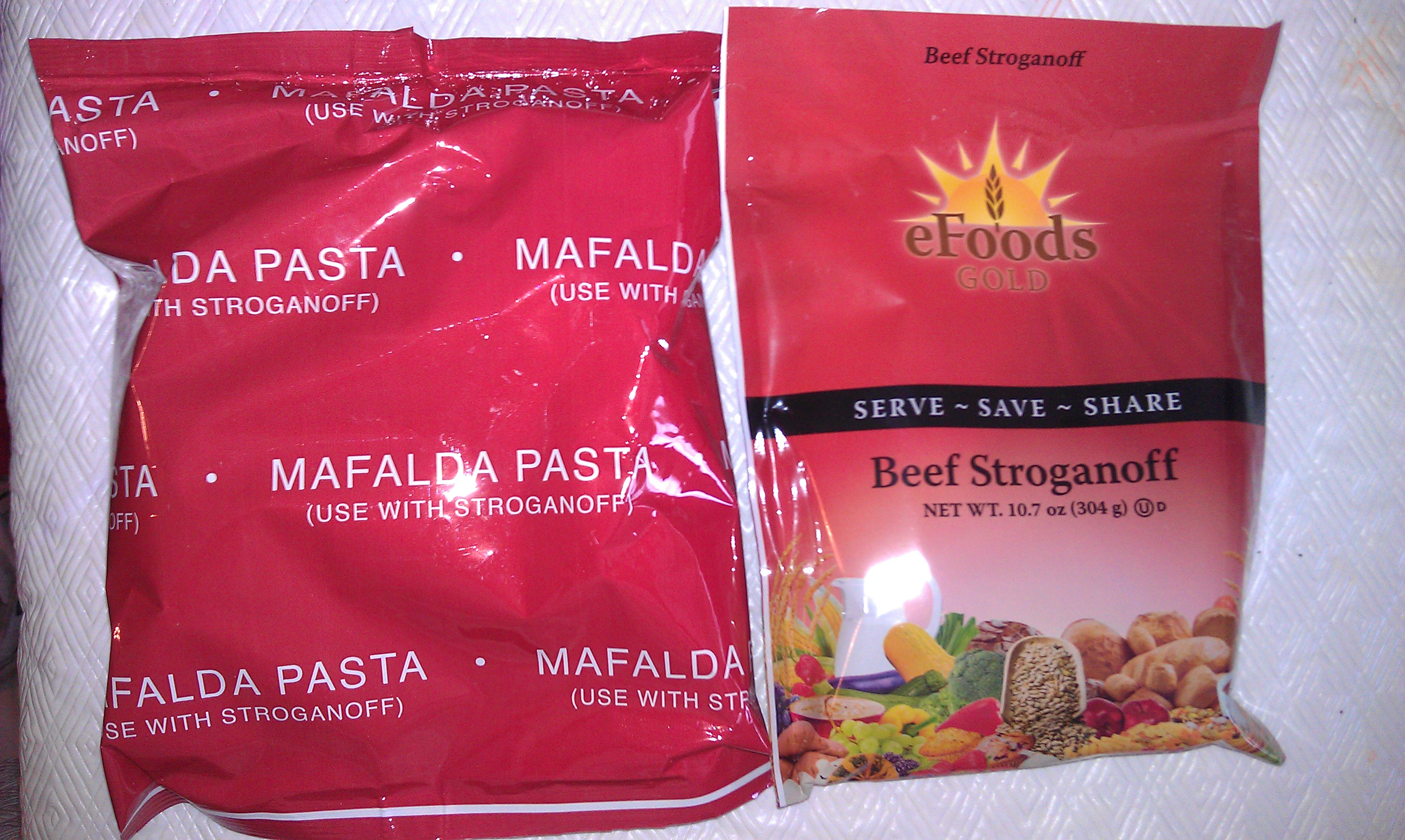 Yesterday afternoon I decided to take care of making lunch for the wife, kiddo, and I so up for review is eFoods Global Harvest Beef Stroganoff. This particular meal came in two separate bags: one containing noodles, the other the Beef Stroganoff mix. The following two pics show the front and back of both bags: