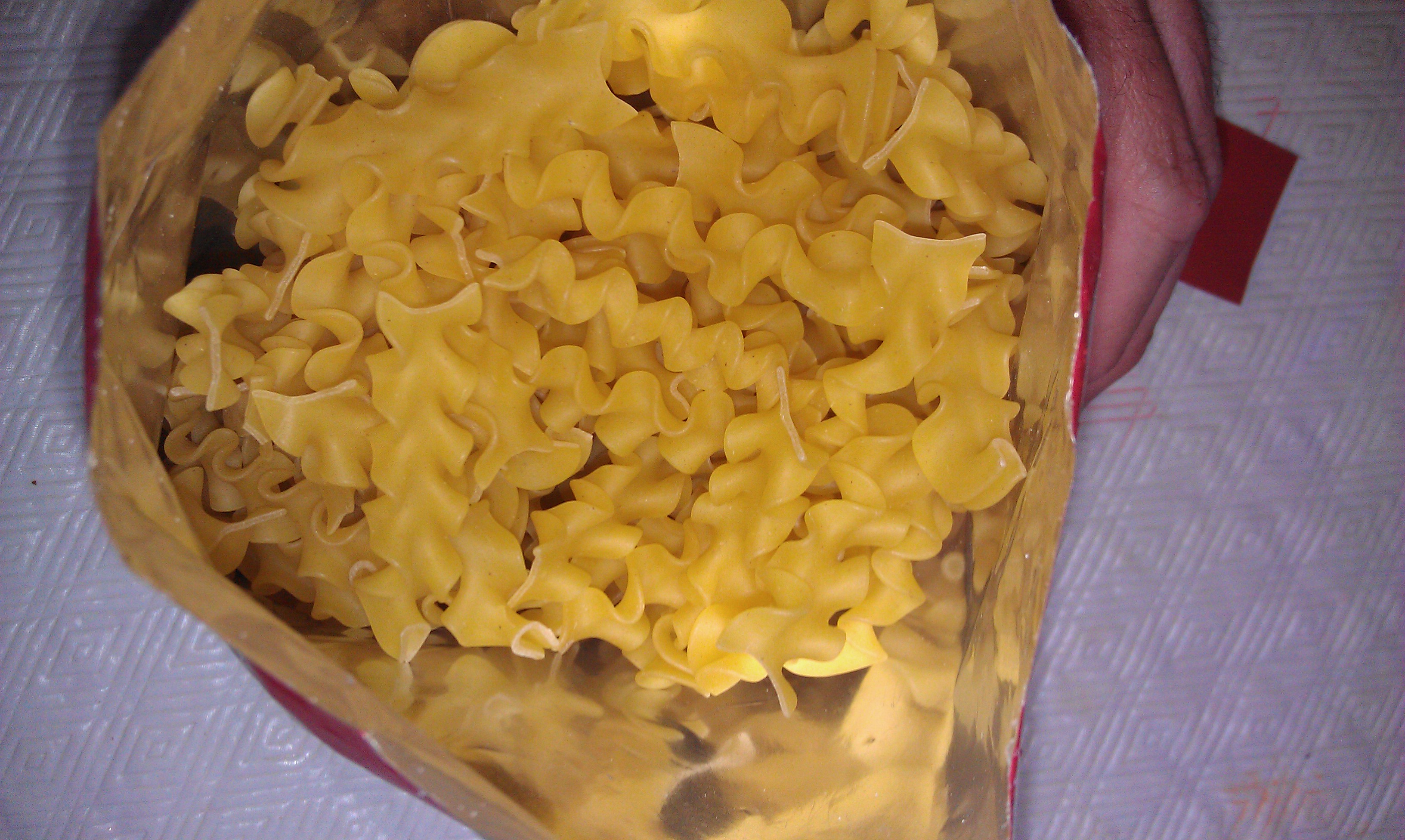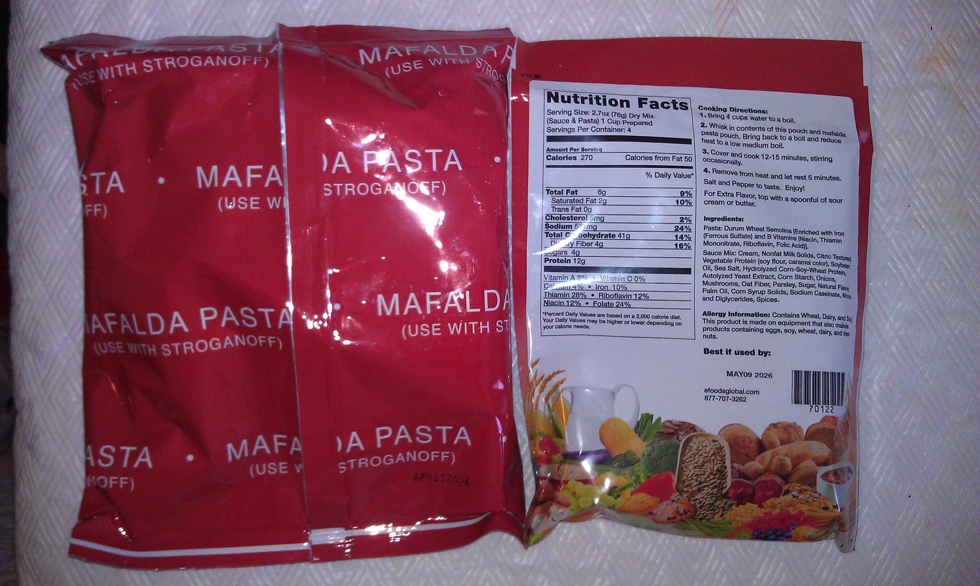 Opening the bag of mafalda noodles, they appeared just as one would expect. Typical dried noodles. The bag of Beef Stroganoff mix looked like flour, with no discernable chunks of meat. The smell was like sour flour, and a bit off-putting.