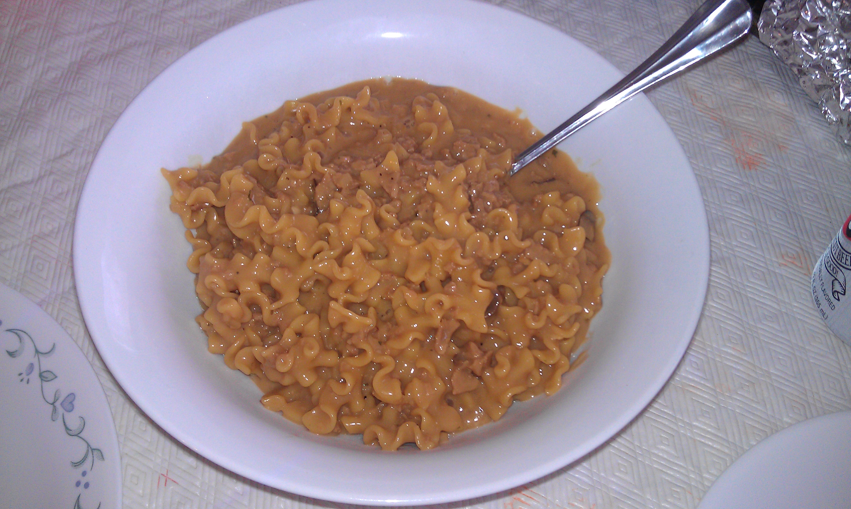 APPEARANCE: At first I was a little disappointed at the lack of meat in the dish. As you can see in the above pic, there are only small flakes of meat. No good sized chunks to sink your teeth in. The noodles seemed a little too soft. The color of the sauce was a little lighter than most Beef Stroganoffs I have had. The sauce seemed fairly thickened, and was nowhere near as watery as I feared it may be when I first began cooking it.