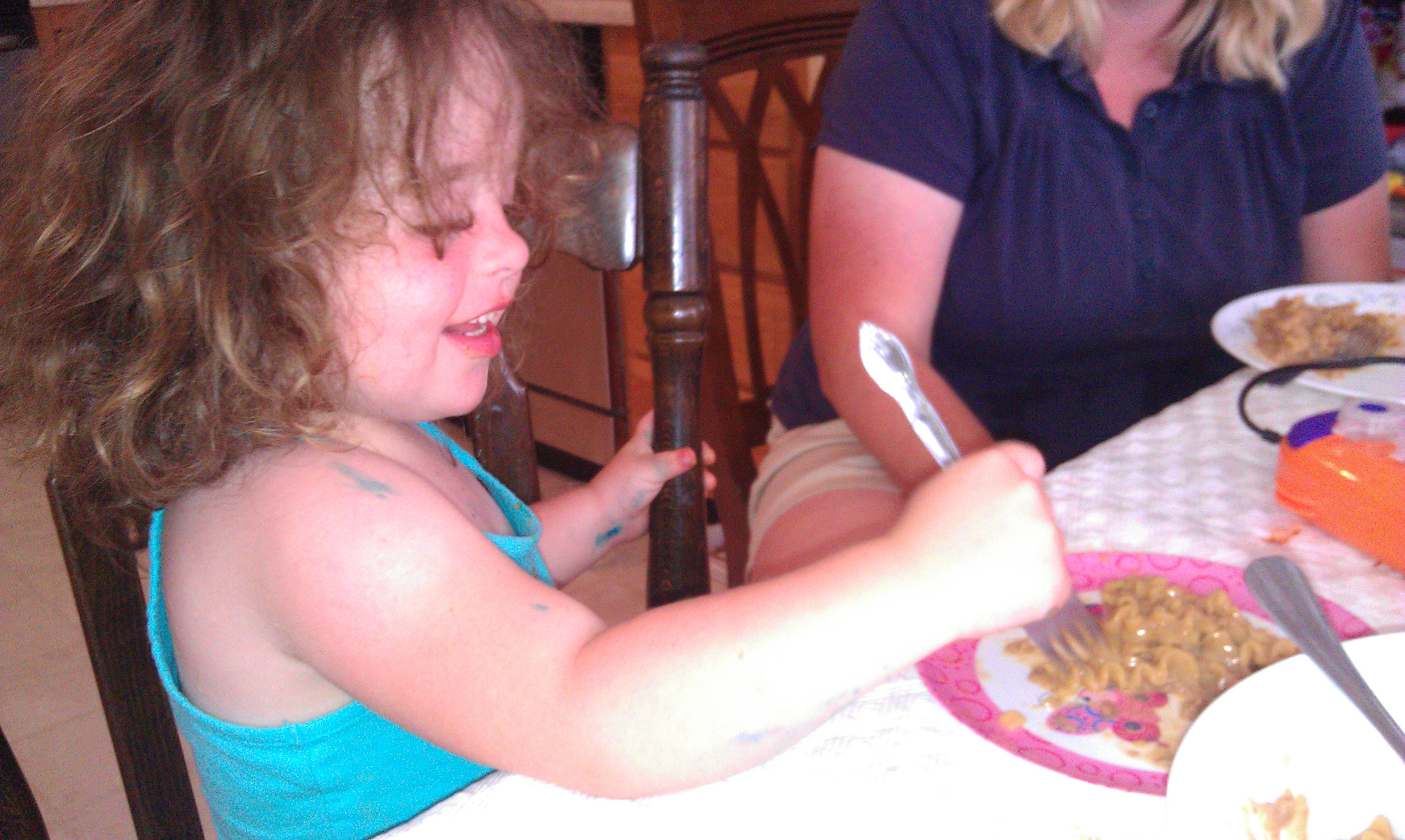 My wife and daughter also seemed to like it. The bag suggests it is 4 serving sizes, but there was plenty for my wife and I to have seconds, and one helping for my daughter. After a hard day of playing outside in the sprinkler and painting, the meal was well received by her: