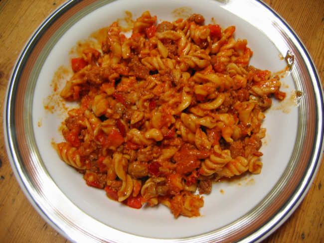 This dish is a nice varity to the other 6 entrees and it´s very typical German. It´s not too hot or spicy, the only drawback is the noodles will get soaked after a too long storage. But this entrees are made to be eaten