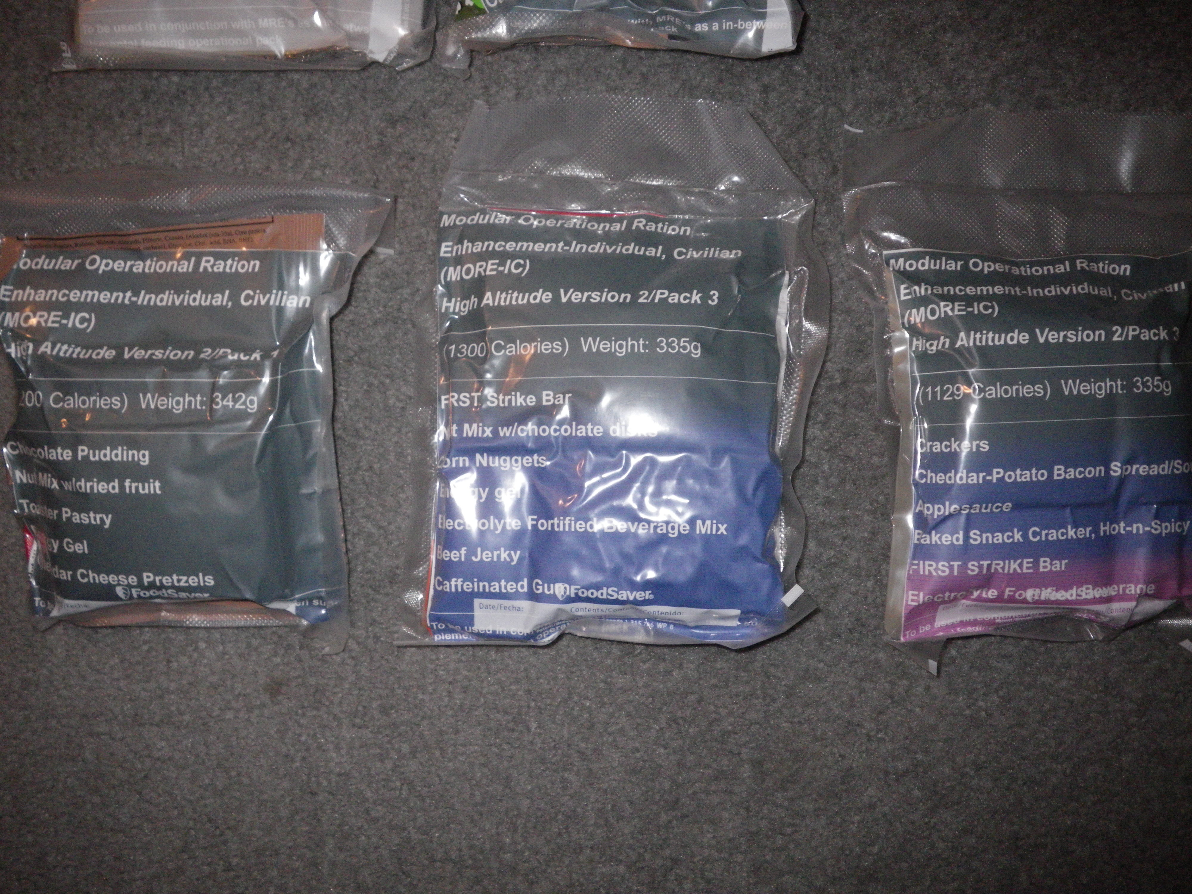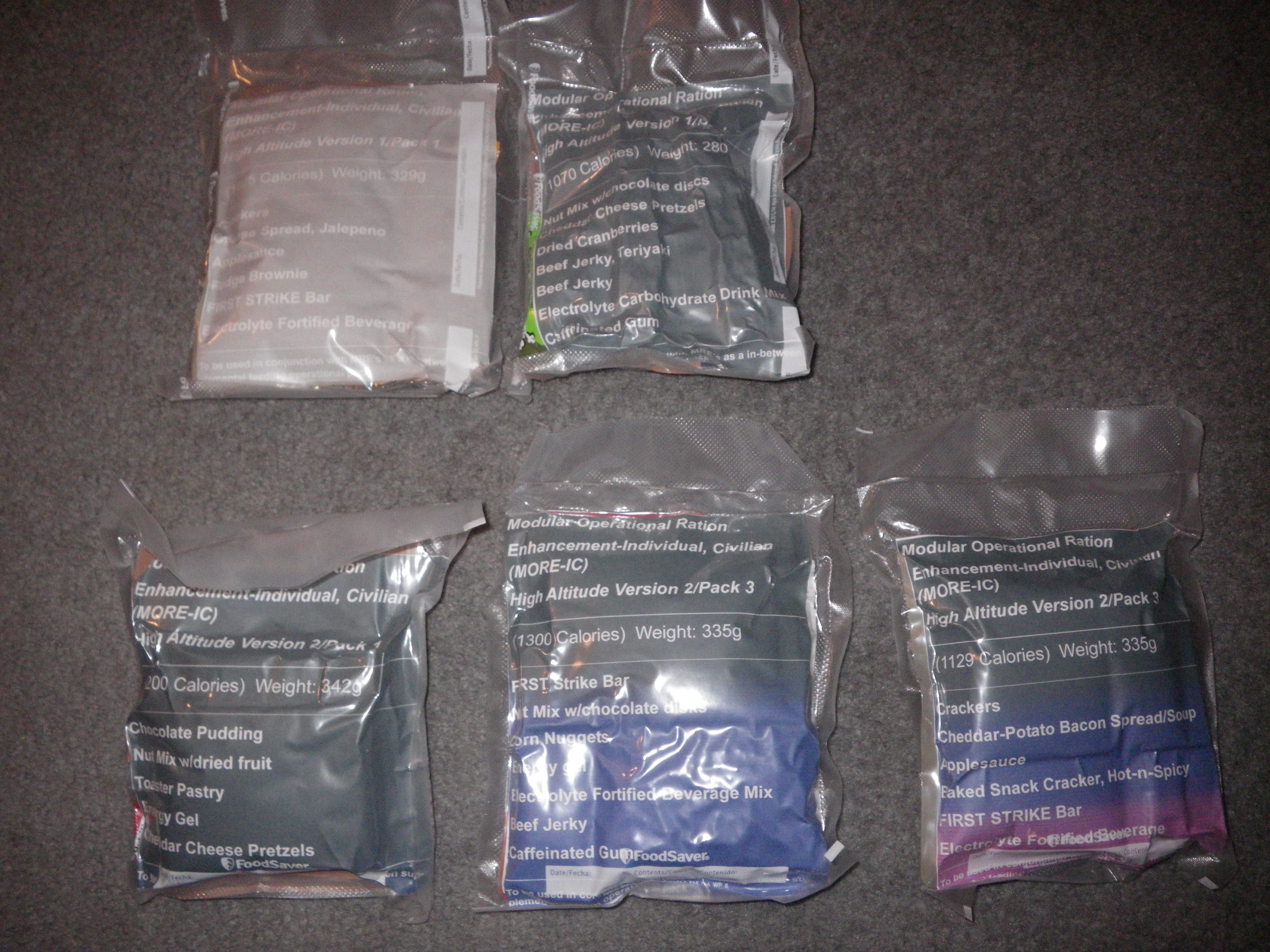 They come 5 pouches to a set and have all the items listed on the front. I went with the first Natick report that recommended using existing MRE stocks as supplements. In each of the pouches there are several MRE items in them with the exception of one or two items that are not available to the civilian consumer. So like my FSIR’s they are about 98% correct much like the originals.