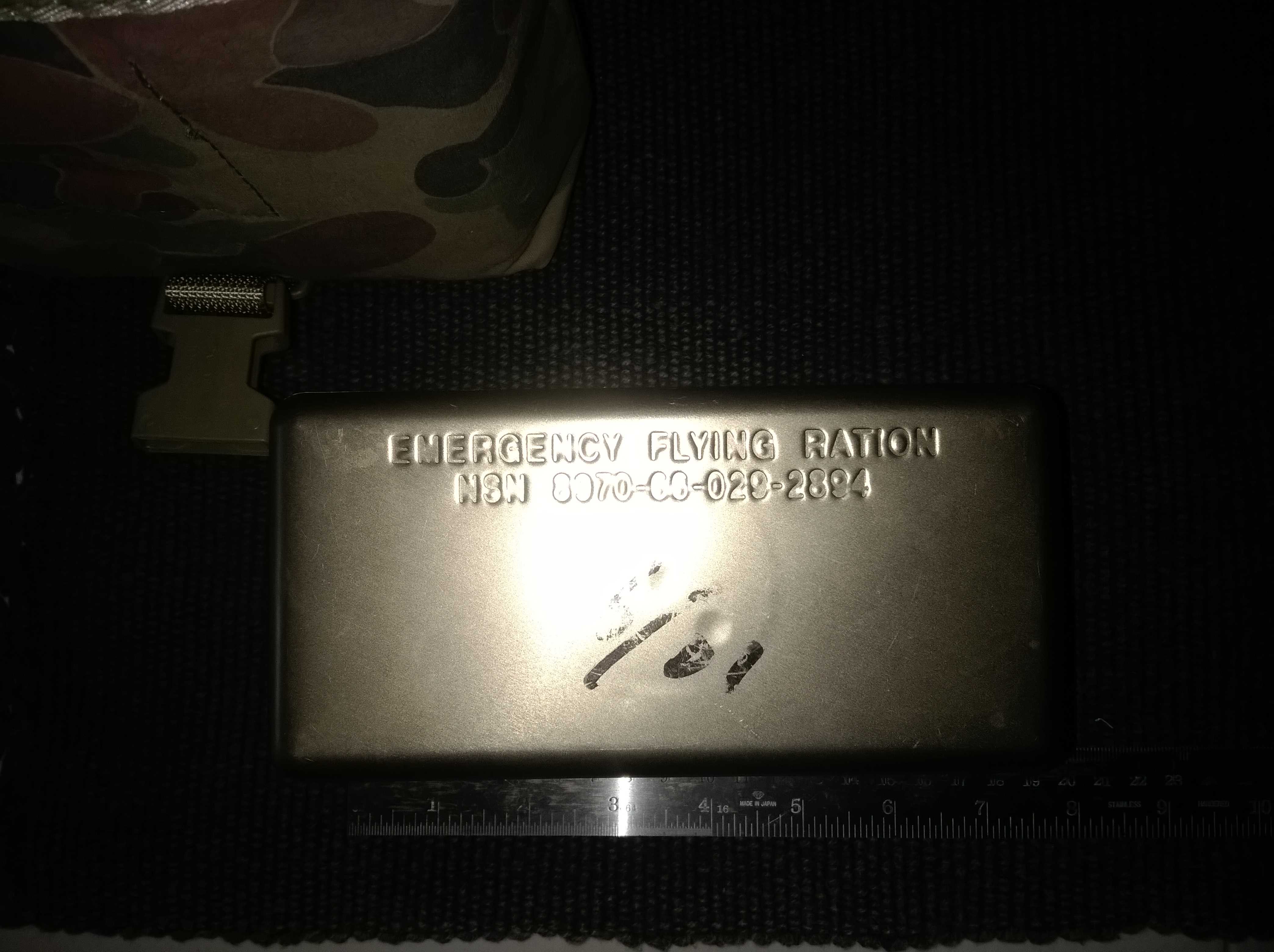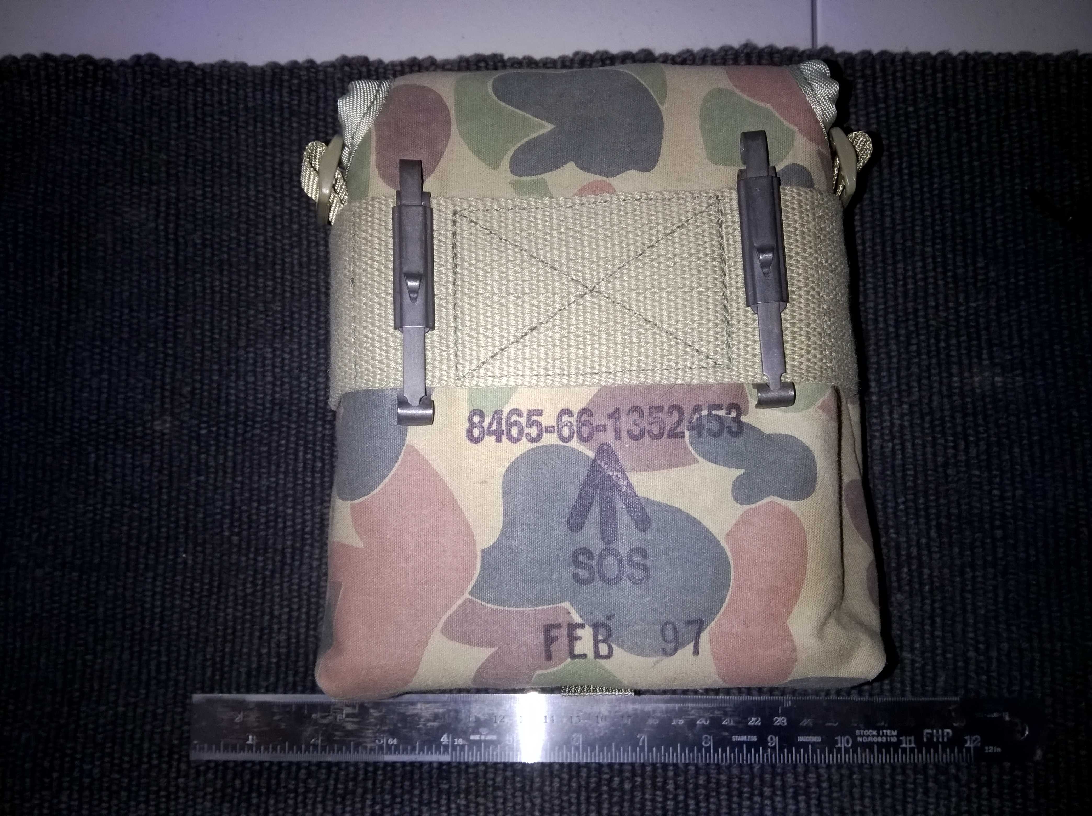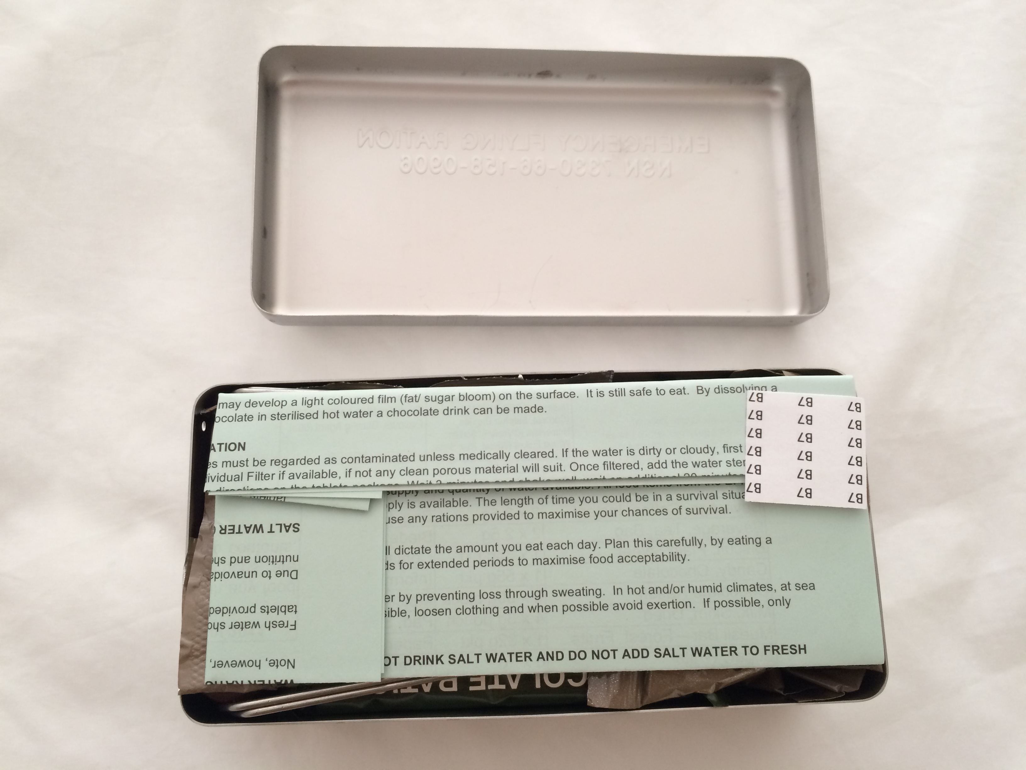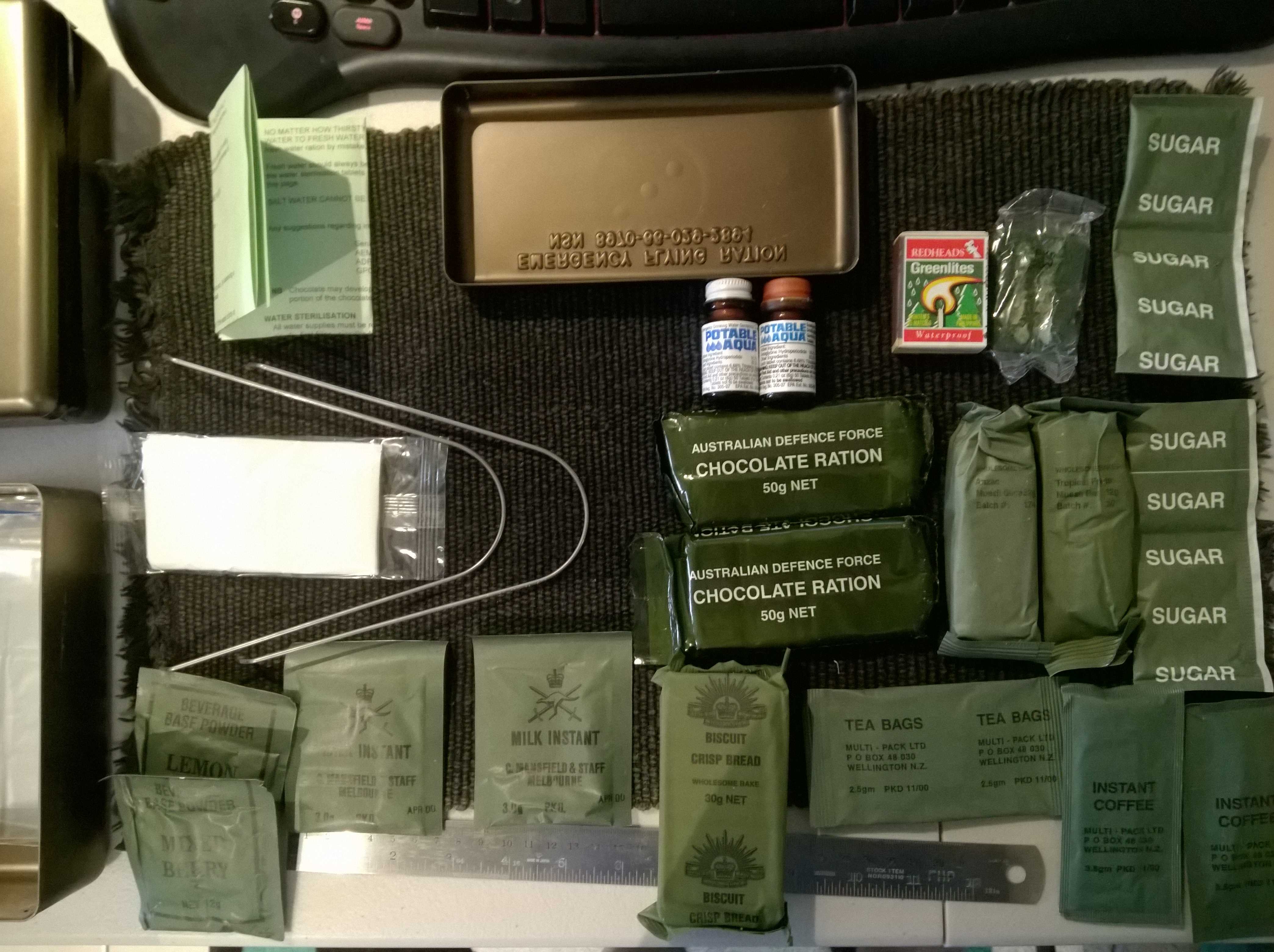 Top pamphlets is a list of contents and instructions for water purification. The two wires you see on the left are for converting the case into a canteen for boiling water. The energy drink powder had already become solid, so it appears the duct tape wasn't that great at keeping out the moisture. In there is two bars of chocolate, pack of M&M's, small muesli bar, packet of biscuits (scotch fingers), tea, coffee, sugar, milk powder, beverage powder, matches, toilet paper, scouring pad and the usual plastic bags.