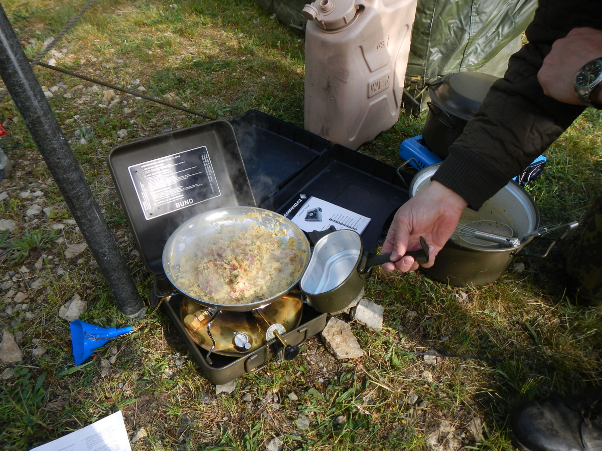 Boil 3 ltrs of water The freezedried 2005 (!) pea stew stir into boiling water cook for 10 min Enjoy your meal I had my drone with me and made a little video about the camp and the tour into the training area: