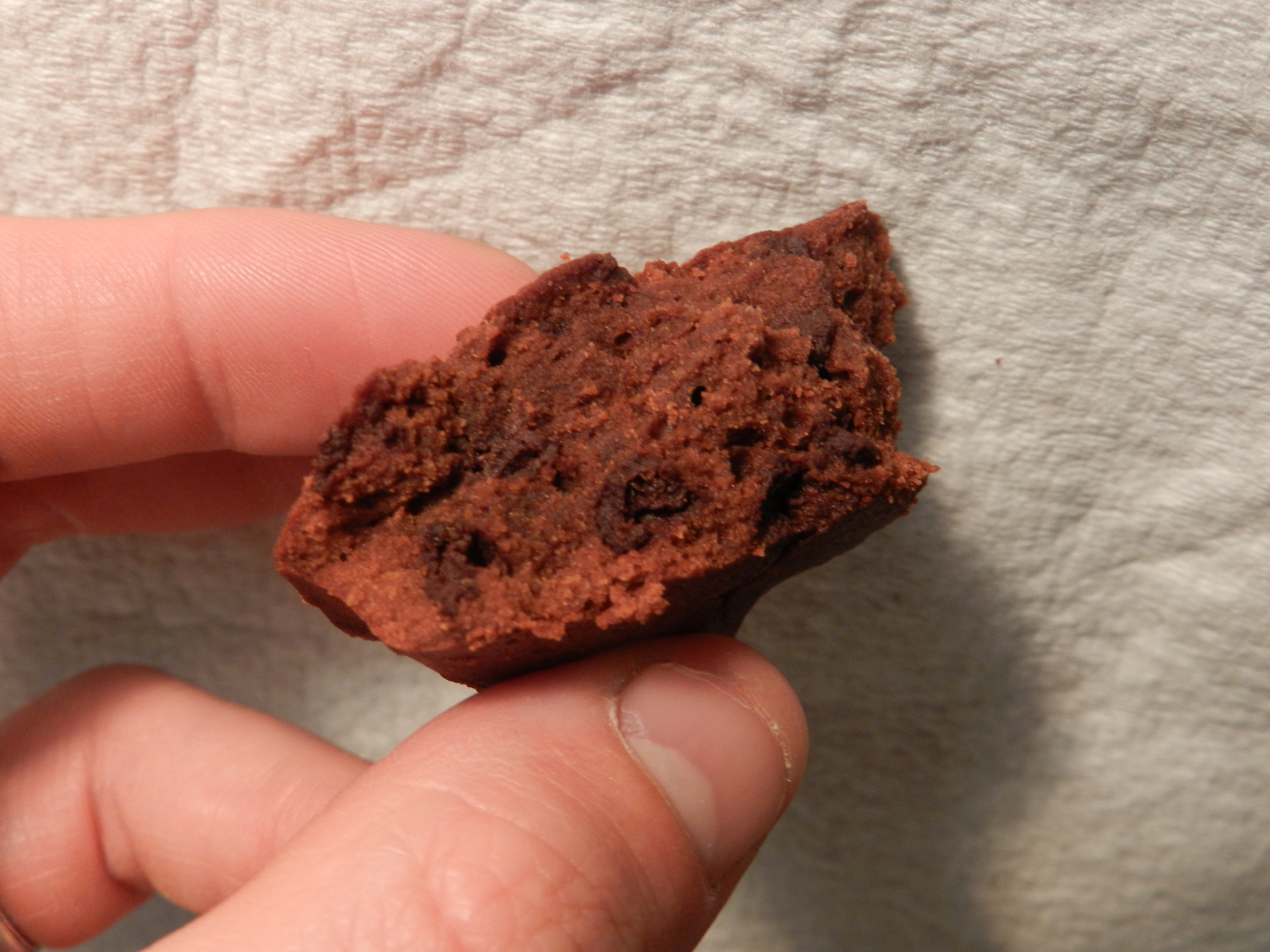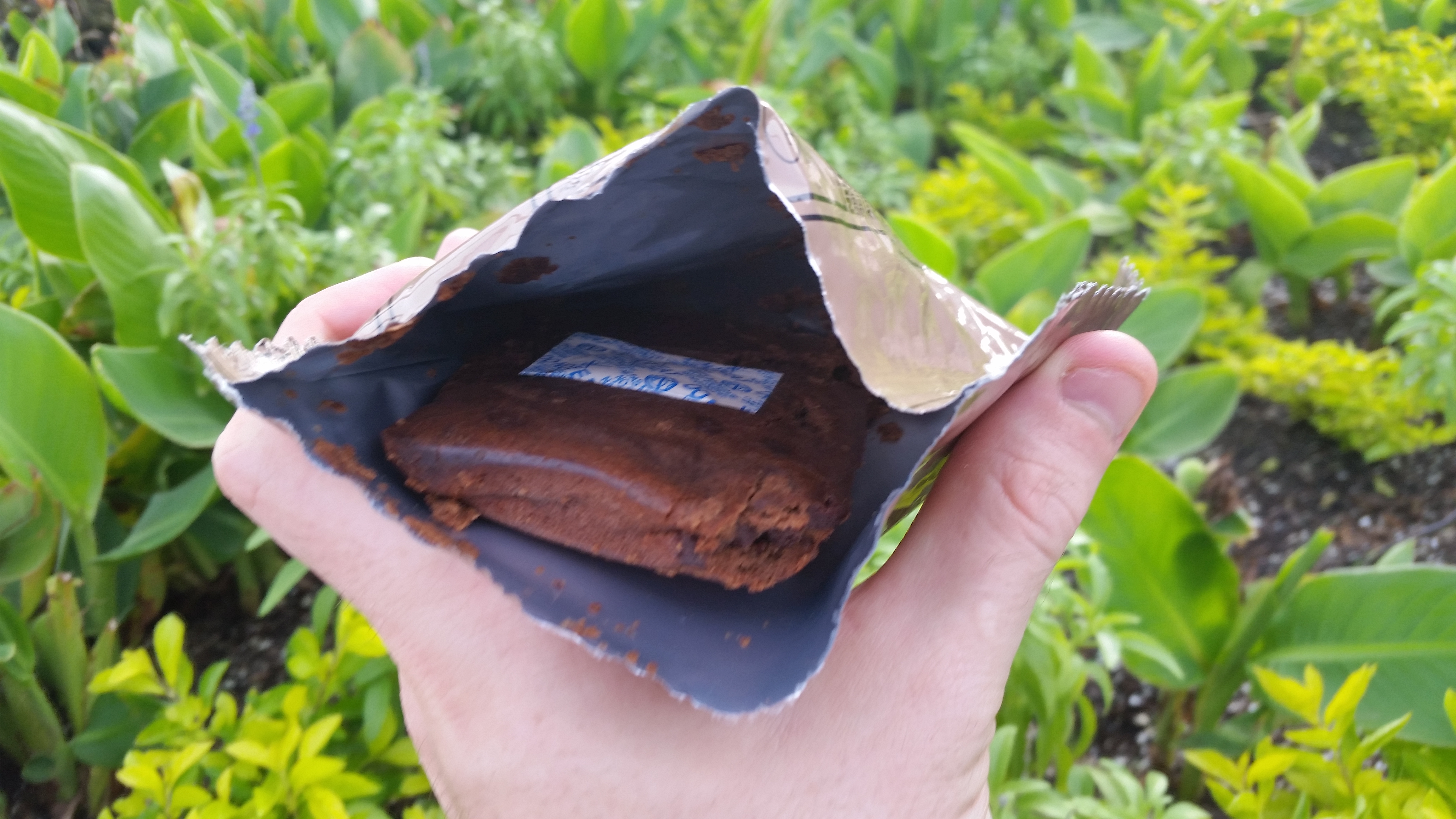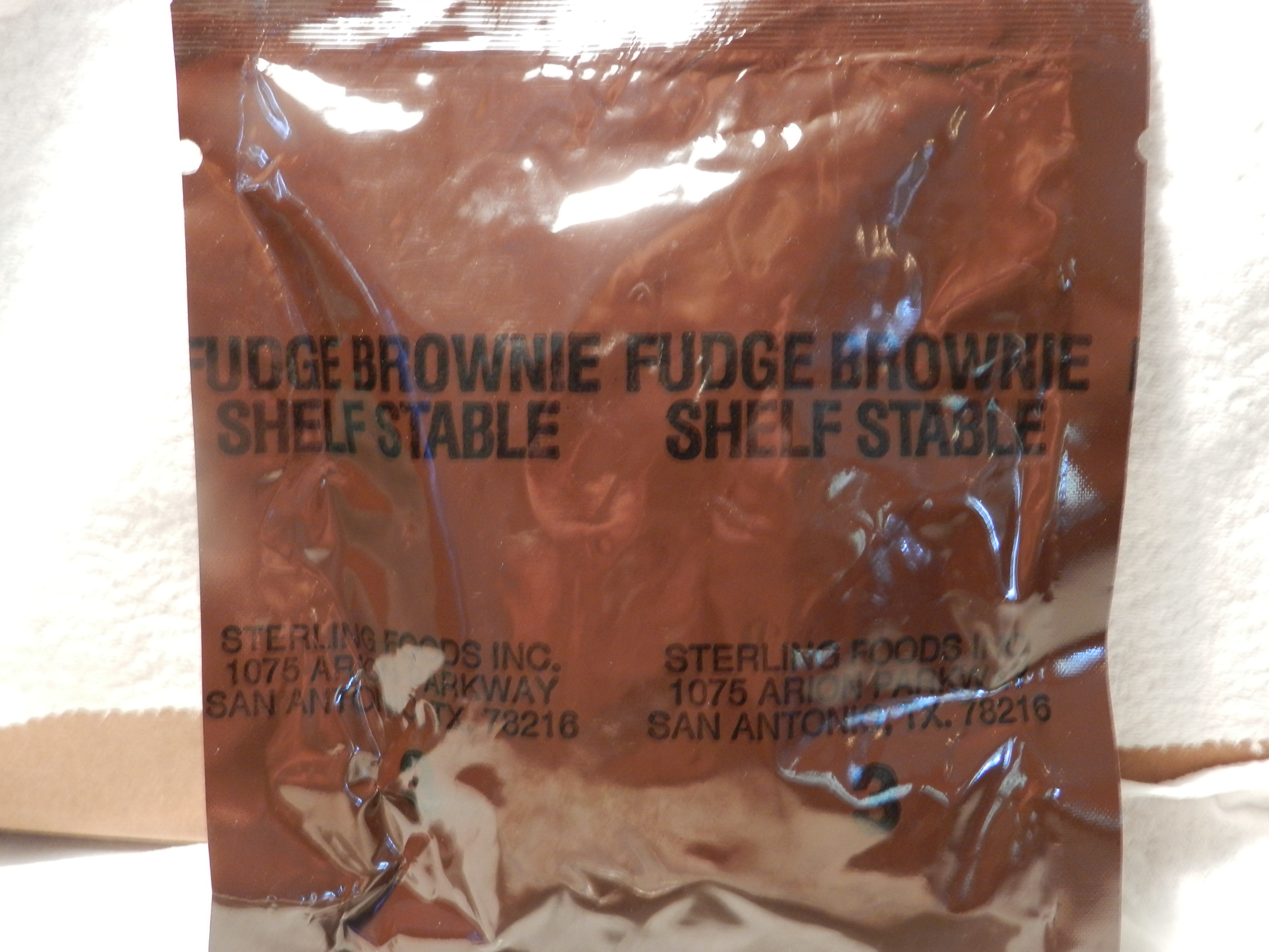 It's more moist than old school mre brownies. Same flavor, different consistancy. The texture is moist, spongy, and the flavor is up to par on my standards, but Carol says it's not "fudgy" enough. So my thoughts for Sterling Foods? Add more cocoa!