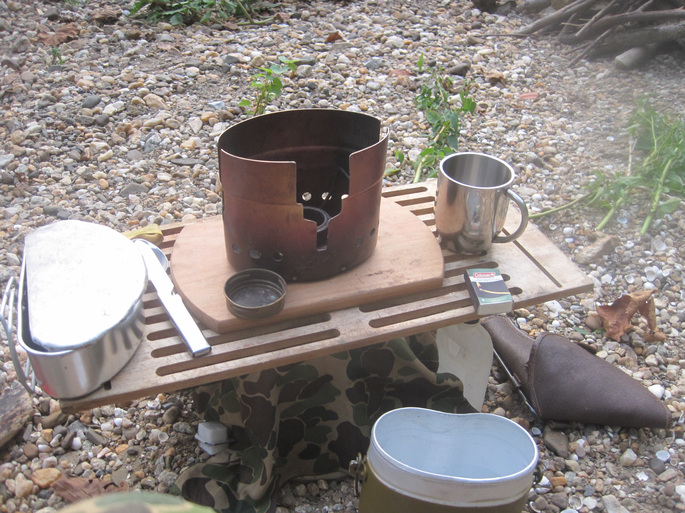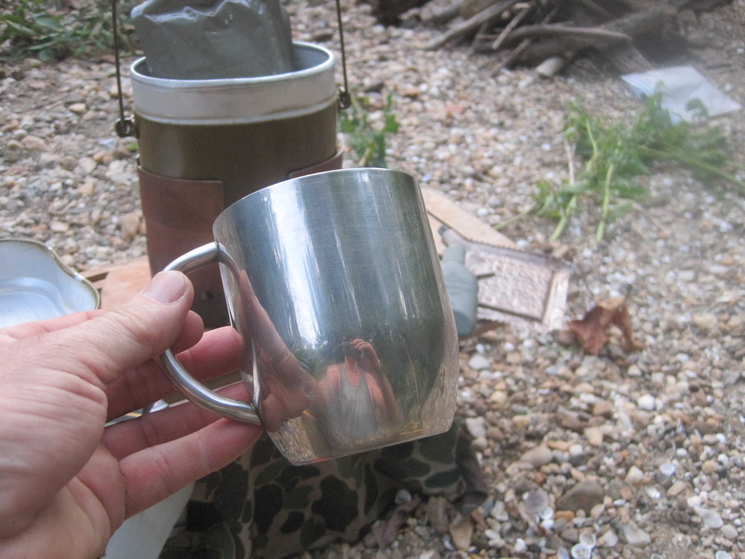 Cooked with Russian Army kettle and Swedish stove. The stainless steel cup is a gift from my Friend Prado67. This cup is Russian Issue and kept the Iced Tea cold and Coffee. Yet did not burn my lips. The paint on the Russian kettle did not blacken and stayed their particular Olive color. As for trip the weather was perfect just a little hot. Clear sky at night and you could see the stars.The river was low but it ran clear so you could see fish and river plants just like a fish tank. This is why I like miltary rations and gear. It lends itself to my needs. Simple easy to use and prepare.