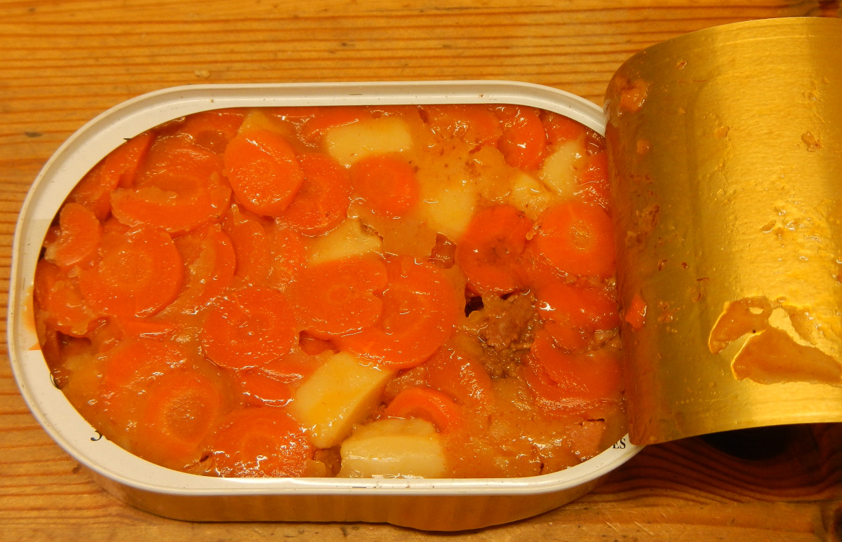 Next the beef and carrots look like a fine entree. Even in the can they look appetizing, on the plate like a real table meal. The close up photo of the beef appears as if they used a decent cut of beef. Have you ever prepared them in the tin? Either with esbit or boiling entire can?
