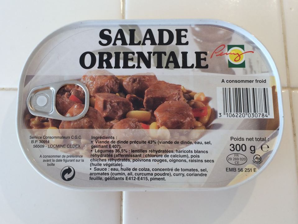 Today for lunch I had an entree from a French RCIR. The entree was "Salade Orietale". The meat is viande de dinde, which is turkey. The entree is pretty fresh, with an expiration date of Feb 2018. The can was in perfect shape.