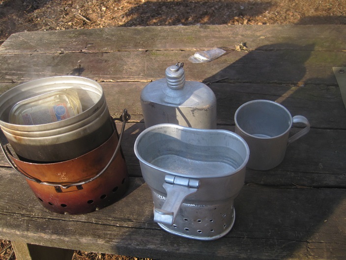 I figured this would be a fine meal since it was windy and brisk outside . Entrees were cooked in a Russian Airborne kettle and Swedish stove via Trangia alcohol heaters