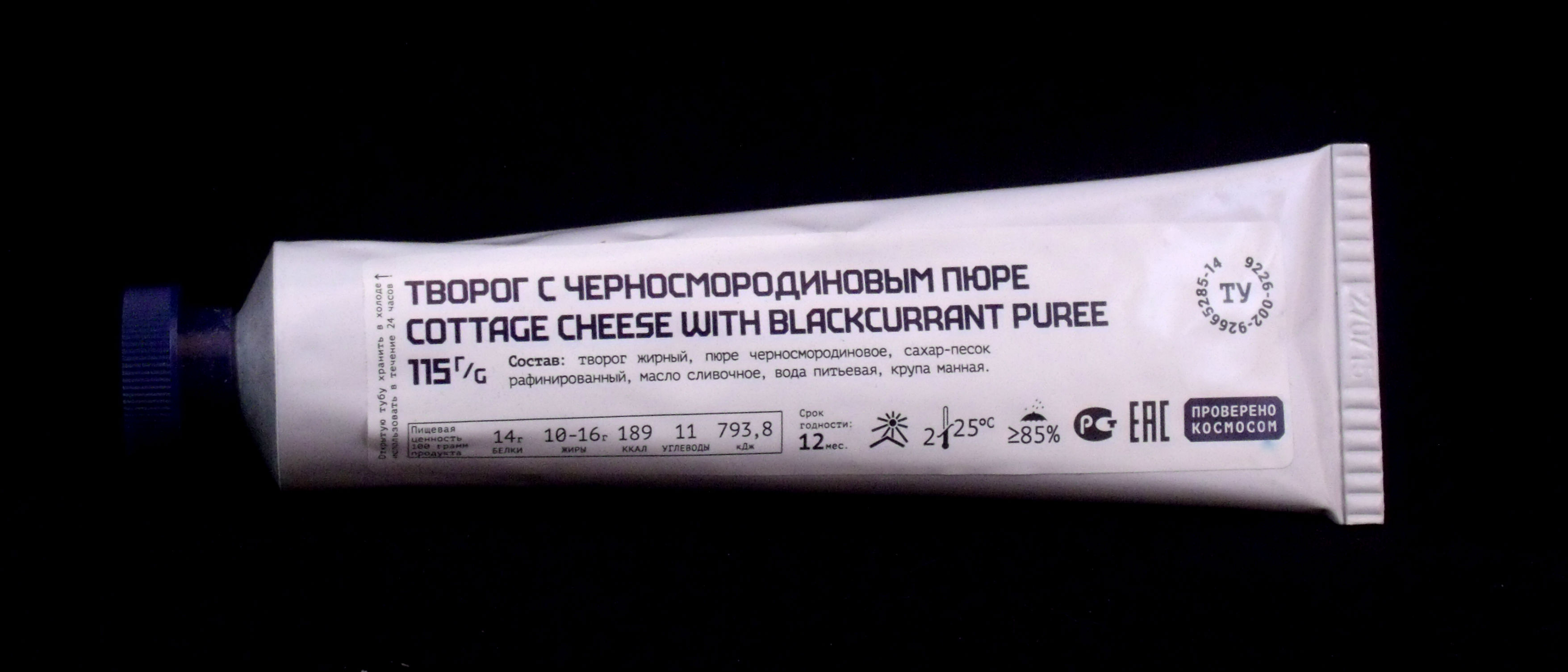 With the meal I had two drinks. The first was a tube of ready-to-drink Cherry and Apple Juice. I had to unscrew the top and pierce the tube, then screw the cap back on. I poured some into a clear tumbler for the review pictures, but I drank the remainder from the tube directly. Just like a boxed apple/cherry juice - real fruit juice as far as I could tell. The second drink was the ISS Earl Gray Tea. I opened the end of the pound and unwound the filling tube. This would attach to a hot water dispenser on the space station in order to have the water piped directly to the tea and sugar. It called for 200ml of hot water and made a nice smooth tasting drink.Cottage cheese solids, mashed blackcurrant, refined granulated sugar, butter, water, semolina groats
