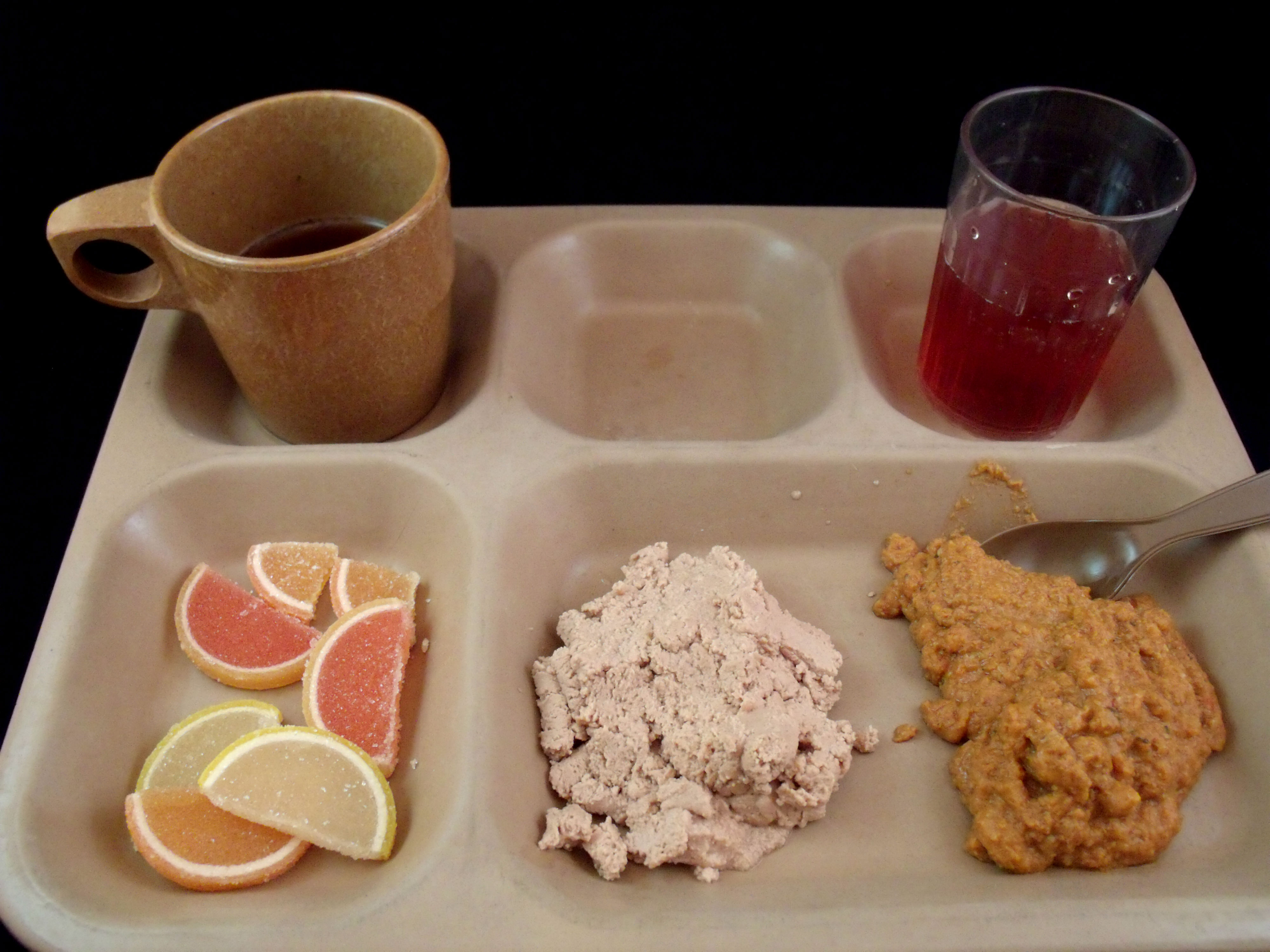 With the meal I had two drinks. The first was a tube of ready-to-drink Cherry and Apple Juice. I had to unscrew the top and pierce the tube, then screw the cap back on. I poured some into a clear tumbler for the review pictures, but I drank the remainder from the tube directly. Just like a boxed apple/cherry juice - real fruit juice as far as I could tell. The second drink was the ISS Earl Gray Tea. I opened the end of the pound and unwound the filling tube. This would attach to a hot water dispenser on the space station in order to have the water piped directly to the tea and sugar. It called for 200ml of hot water and made a nice smooth tasting drink.Cottage cheese solids, mashed blackcurrant, refined granulated sugar, butter, water, semolina groats