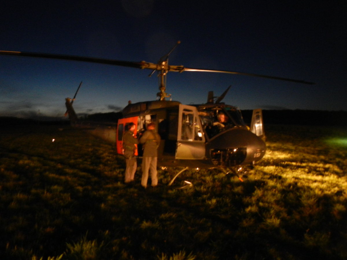 Me and my buddy and neighbor at the "Airfield", note the fire fighters in back ground, set up the floodlight The "HLS" (heli landing site), picture taken from my drone (night vision style) The landed SAR Huey