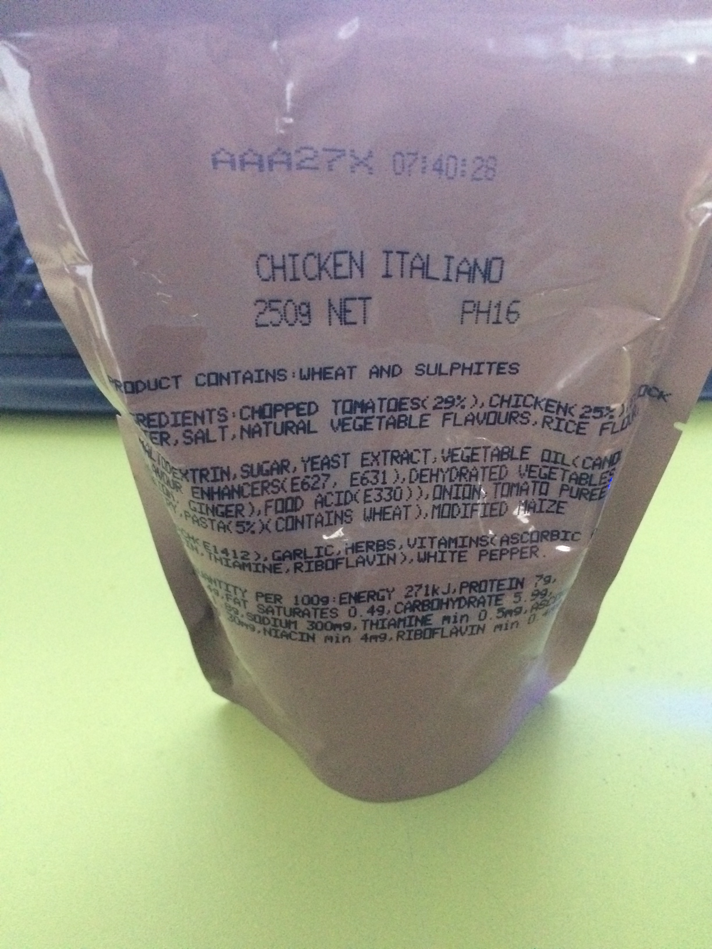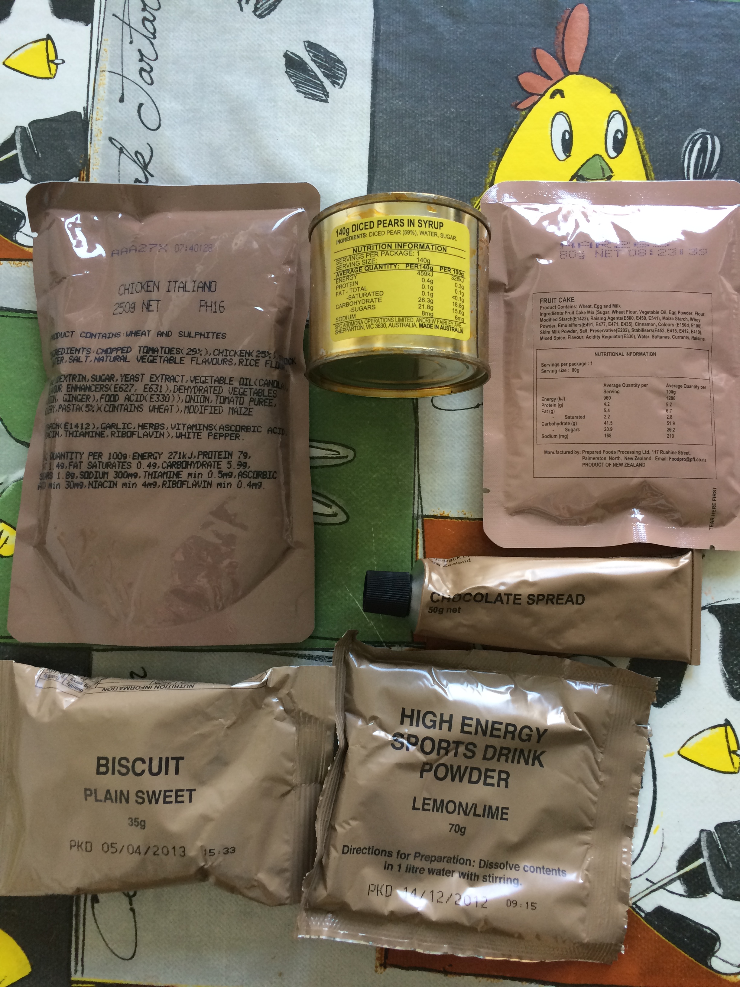 What i selected for Lunch: Chicken Italiano Main entree, Diced Pears, Fruit Cake, Sweet biscuits, Lemon Energy drink and chocolate spread.