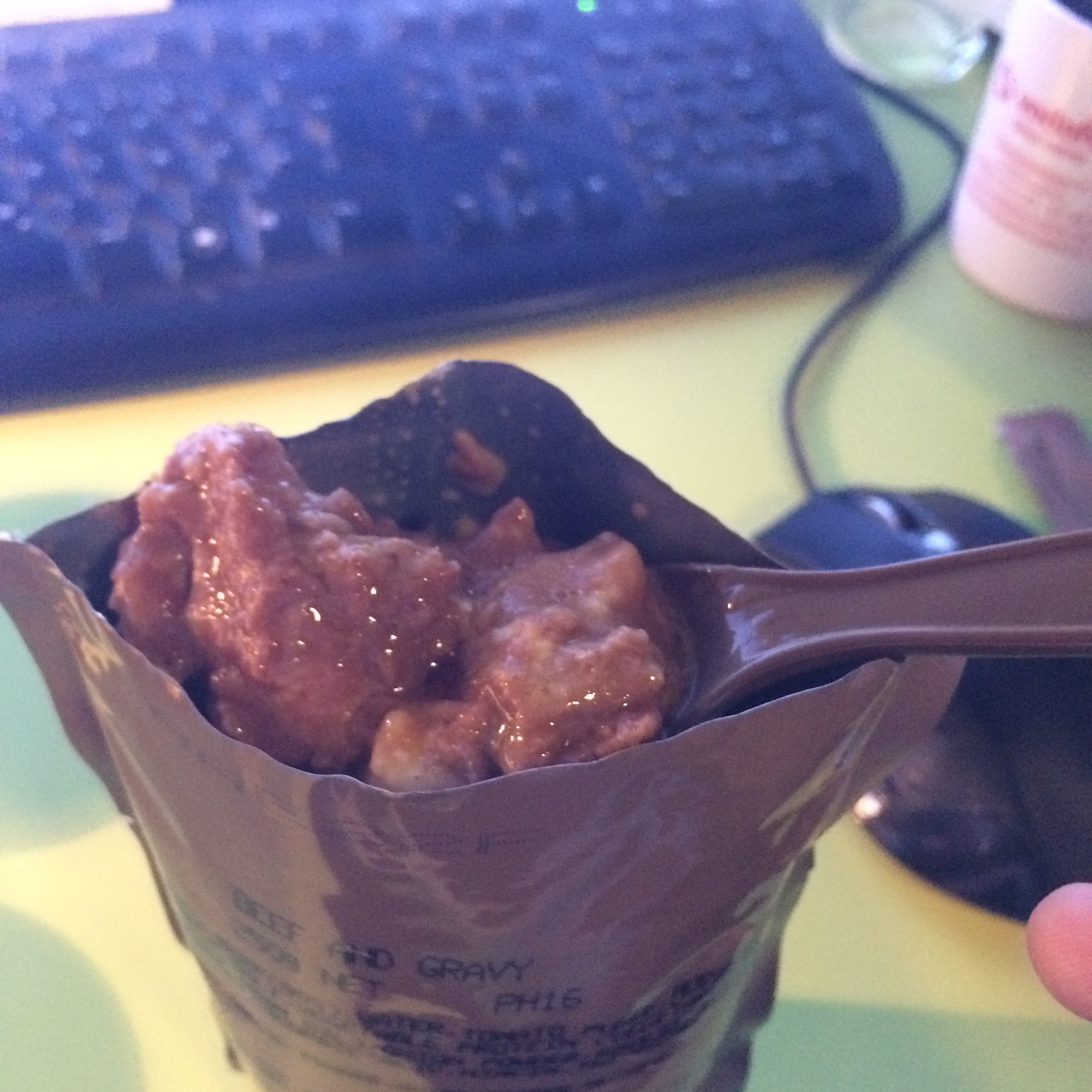 So here is the Dinner Part of the review: I chose for Dinner: Beef and Gravy Main Entree, Chocolate drink powder, pea and Ham cup-a-soup, Apricot Cereal Bar and some chocolate candys.