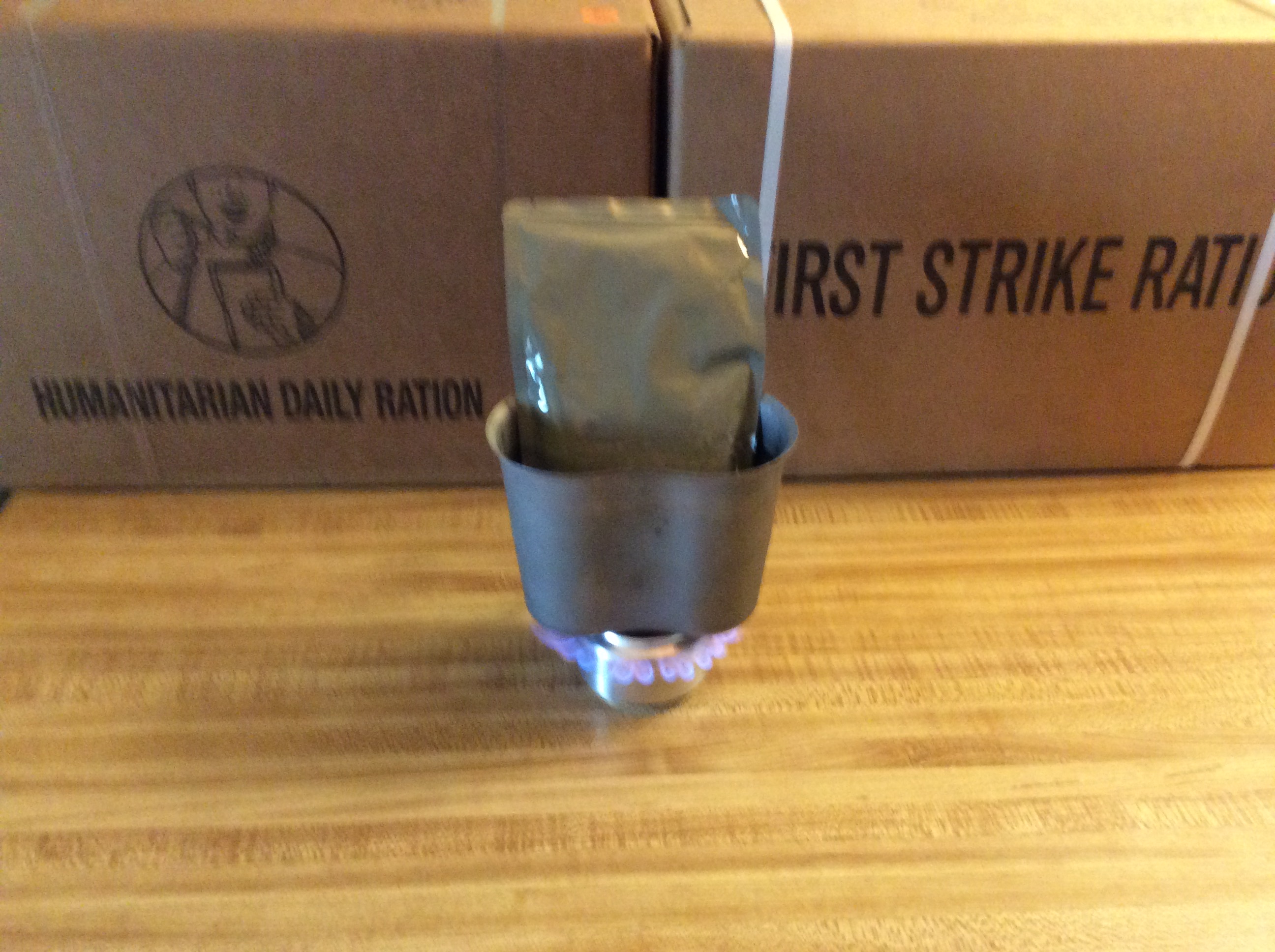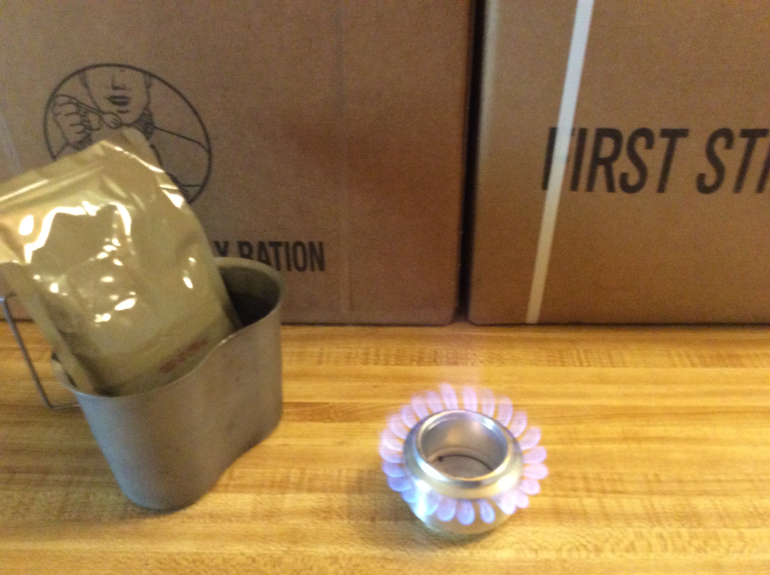 The entree was heated using an alcohol jet stove made from recycled aluminum cans in a half canteen cup of water