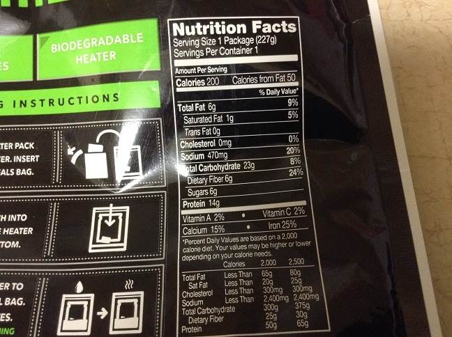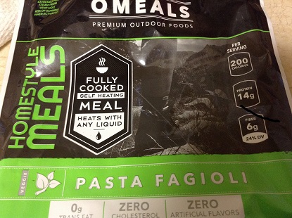 Picked this up at Dicks Sporting Goods(Field and Stream)....Pasta Fagioli...All you do is remove everything from package , reinsert main meal and heater , add 4-6 ounces of water..Wait 3-5 minutes.. You have lunch or dinner....I would definitely eat this again...Was a little spicy but I didn't seem to have any problems from the meal ...The meal is only 200 Calories so you will need other items with it...I had about 6 Jacobs Cream Cracker also...Also only has about 20 percent Sodium if I remember correctly.