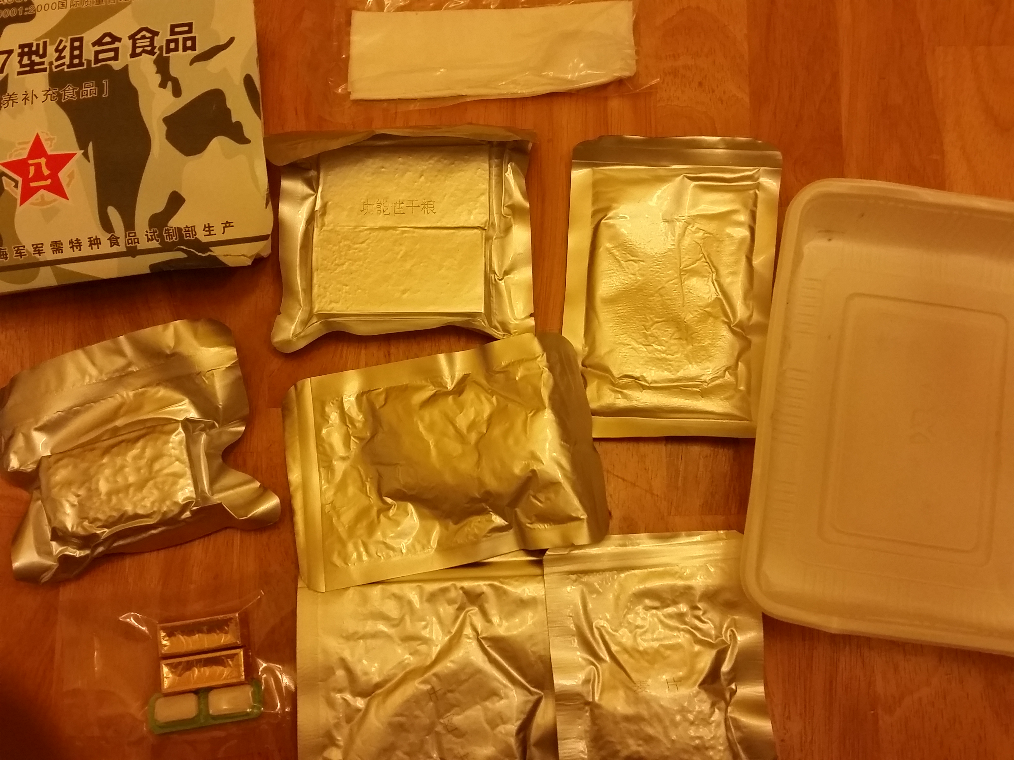 It contained tiny bite of wet packed beef jerkey, 3 cookies, 2 cereal bars, 2 types of pickled vegis, oatmeal, 2 bites of chocolate and 2 pieces of gum. The jerkey was alright. The cookies and cereal bars were good, not sweet at all. I am unfamiliar with what the picked vegis were, one was spicy cabage like and the other was leafy and tasted close to regular american pickles. The green leaf mush looked unappealing, however I enjoyed the flavor. Unfortunatley I ruined the oatmeal by adding too much water. The oats were finely ground with only a few bigger oats visable, it was good again not sweet. The chocolates were just plain ole dark chocolate. Over all I enjoyed this ration, however for what you get these things are way overpriced.