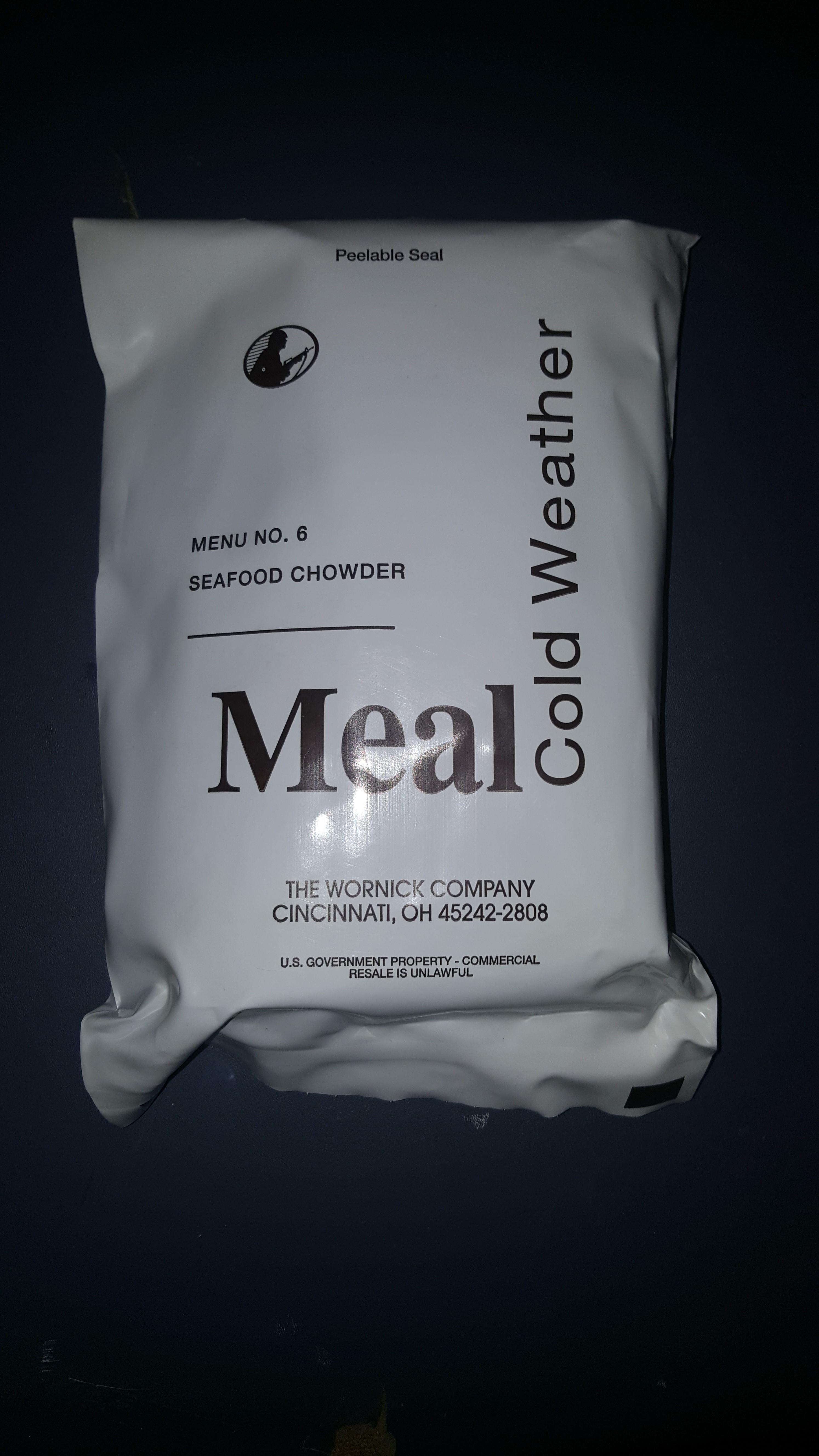 Hi everyone! I've got something of a rarity here, this is a 2013 Seafood Chowder Meal Cold Weather ration produced by The Wornick Company. I've had this menu before, but I figured a review would be fun to do.
