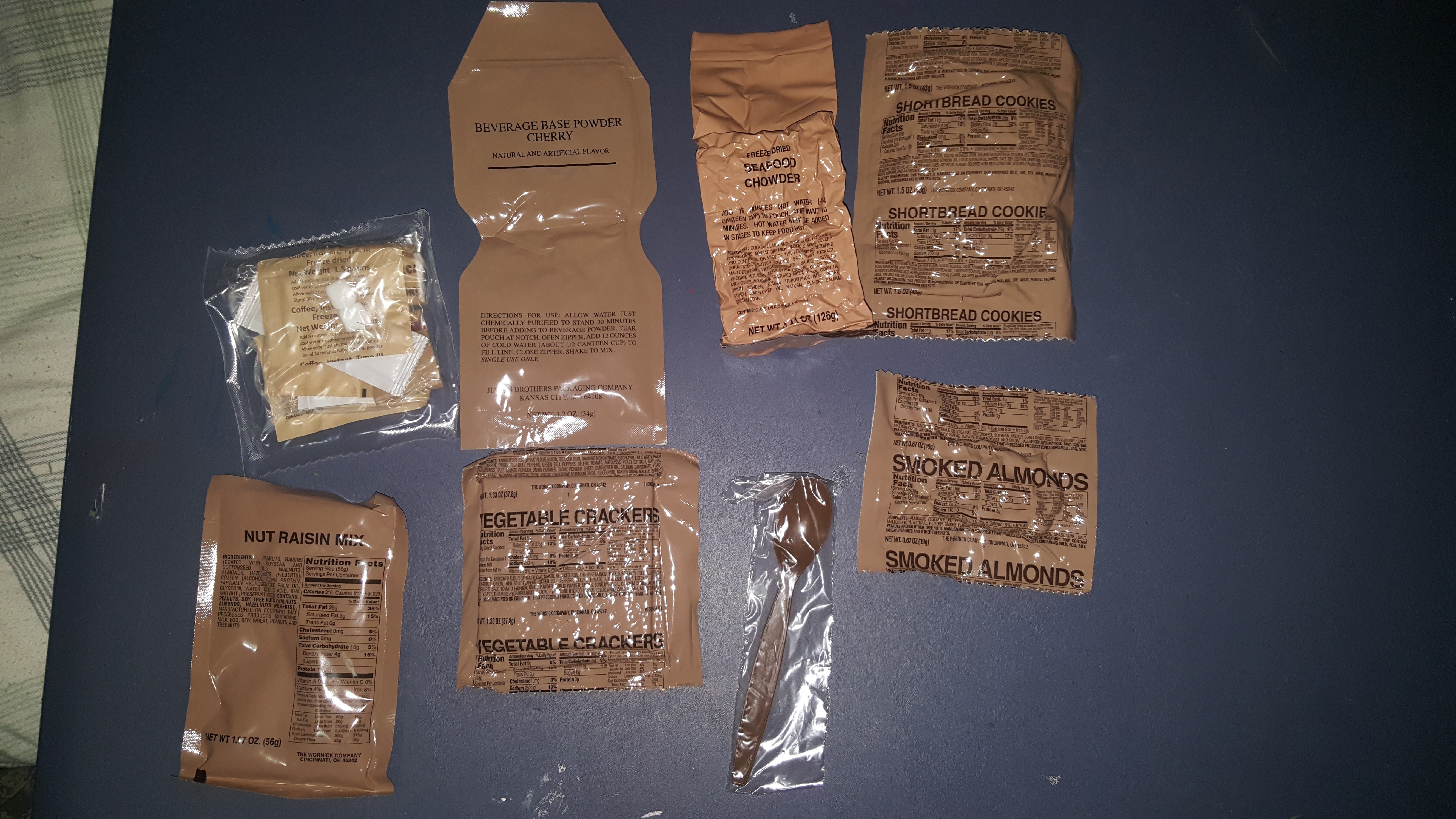 Hmm, where to start? How about the drink? The cherry beverage base had the perfect balance of tartness and sweetness. It did a great job curing my thirst. The nut raisin mix combined with the smoked almonds added were a great protein supplement. Both were very tasty. The vegetables crackers tasted very good on their own. I'm a bit surprised they didn't include cheese spread or peanut butter with this ration. I don't think it was QC because someone here on MREInfo by the name of "norge" did an overview of this meal back in 2012 and his didn't come with anything like that either. Very strange. Anyway, I put some of the seafood chowder on the crackers and ate it that way, and that tasted amazing! Speaking of which, the entree itself was also very tasty. I'm no fan of seafood by any stretch of the imagination, but for some reason, military rations have a weird way of changing my tastes and typical eating habits. For example, I usually try to follow a vegetarian diet in my daily life, but I make an exception for rations.