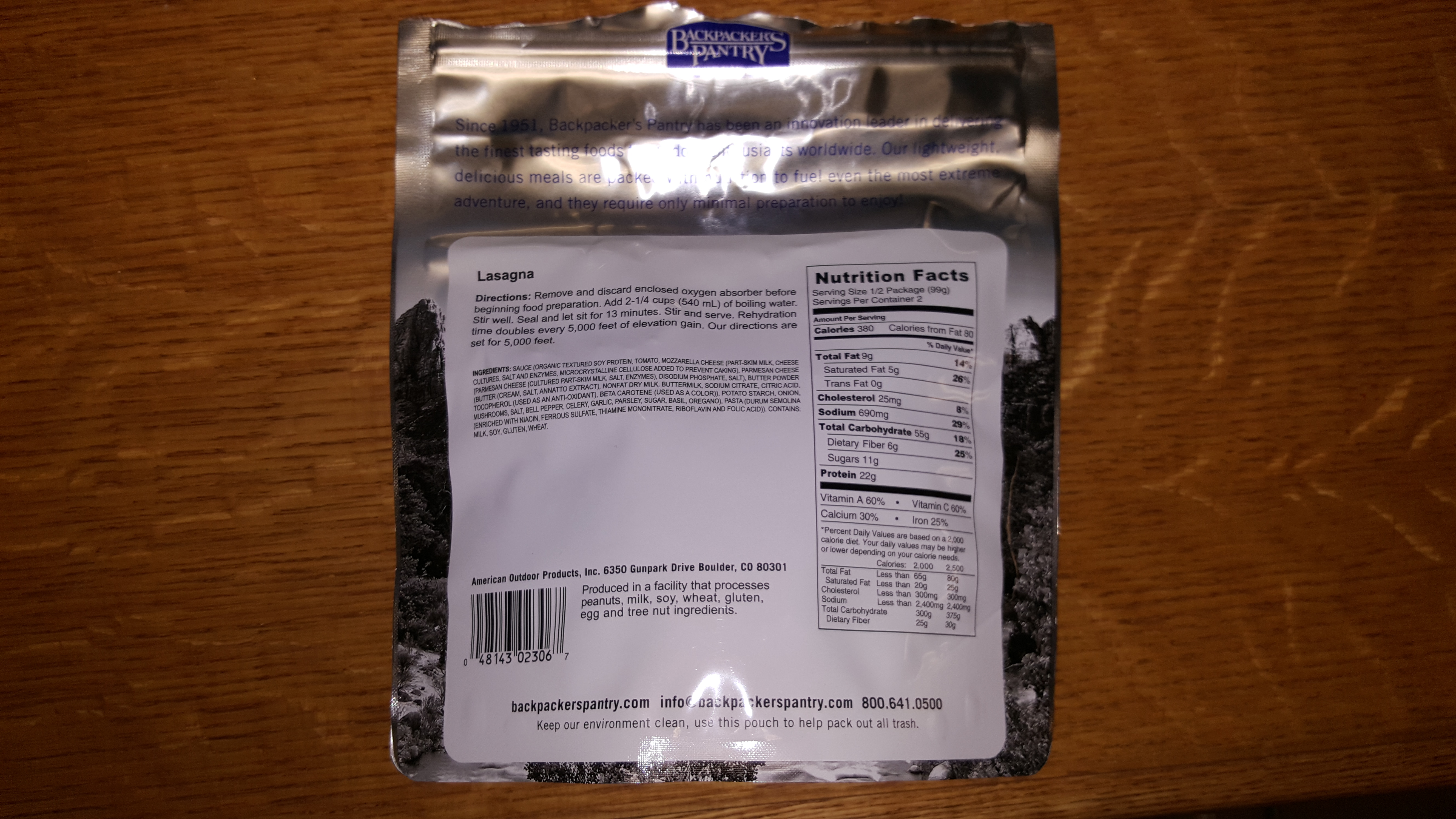 Yesterday during my lunch hour, I decided to take a trip to a nearby sports door. The place I went to was "Sportsman's Warehouse", which recently opened here after a different location in my city closed down shortly after the recession. I decided to get some items for my escape/hiking backpack and stumbled upon dehydrated food. I'm always impressed by this stuff, so I decided to get some. I've had a lot of the food produced by Mountain House, but there was one brand I had not tried and that was Backpacker's Pantry. The menu items sounded tempting, so I decided to pick a few up. Here's the lasagna menu.