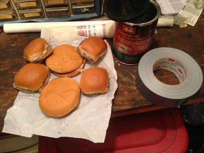Raw materials: Now, I'm not (that) stupid. I know that dairy products are among the first to go in rations, so I used plain burgers instead of cheeseburgers, just to be safe. In deciding which burgers to can, I was torn between White Castle, which are smaller and you can fit more in a can, and McDonalds, which fit my chosen container (an old coffee can) and are notoriously resistant to spoilage. So I used both: