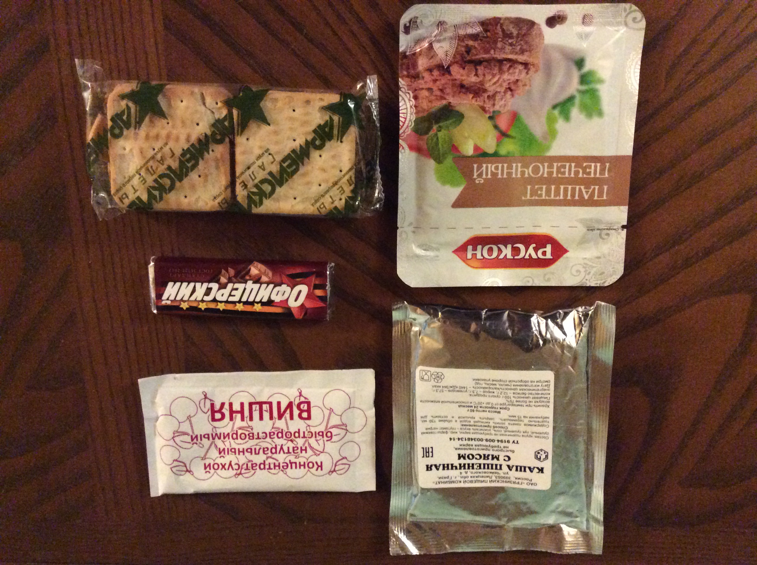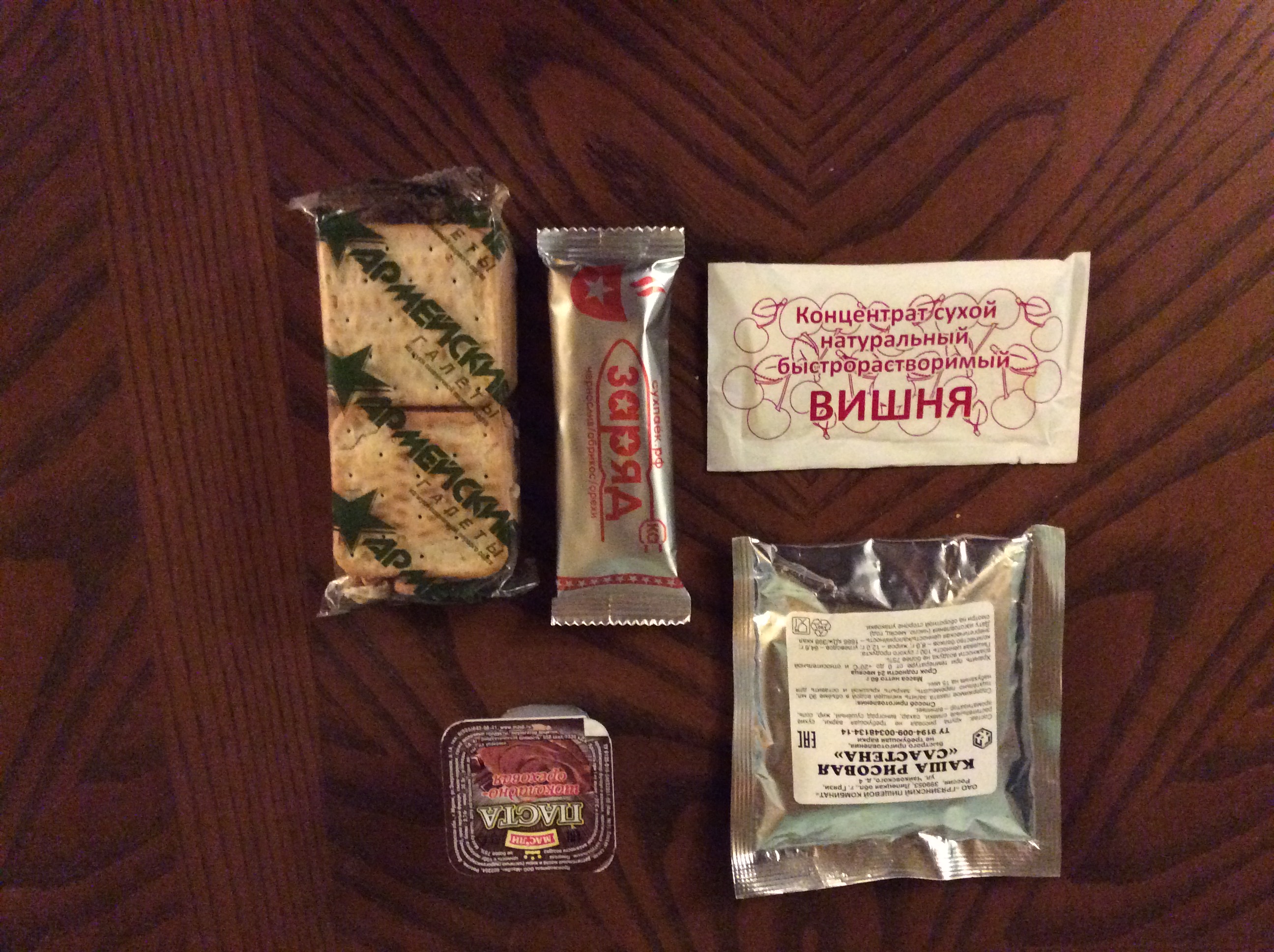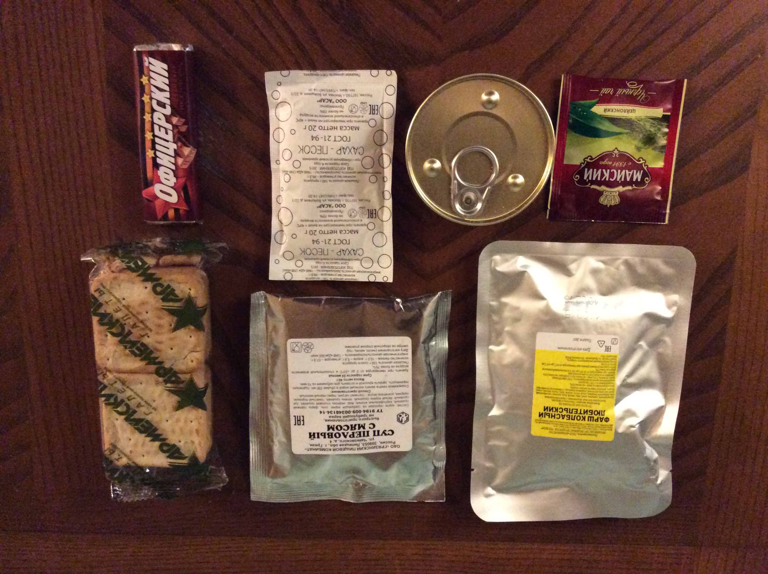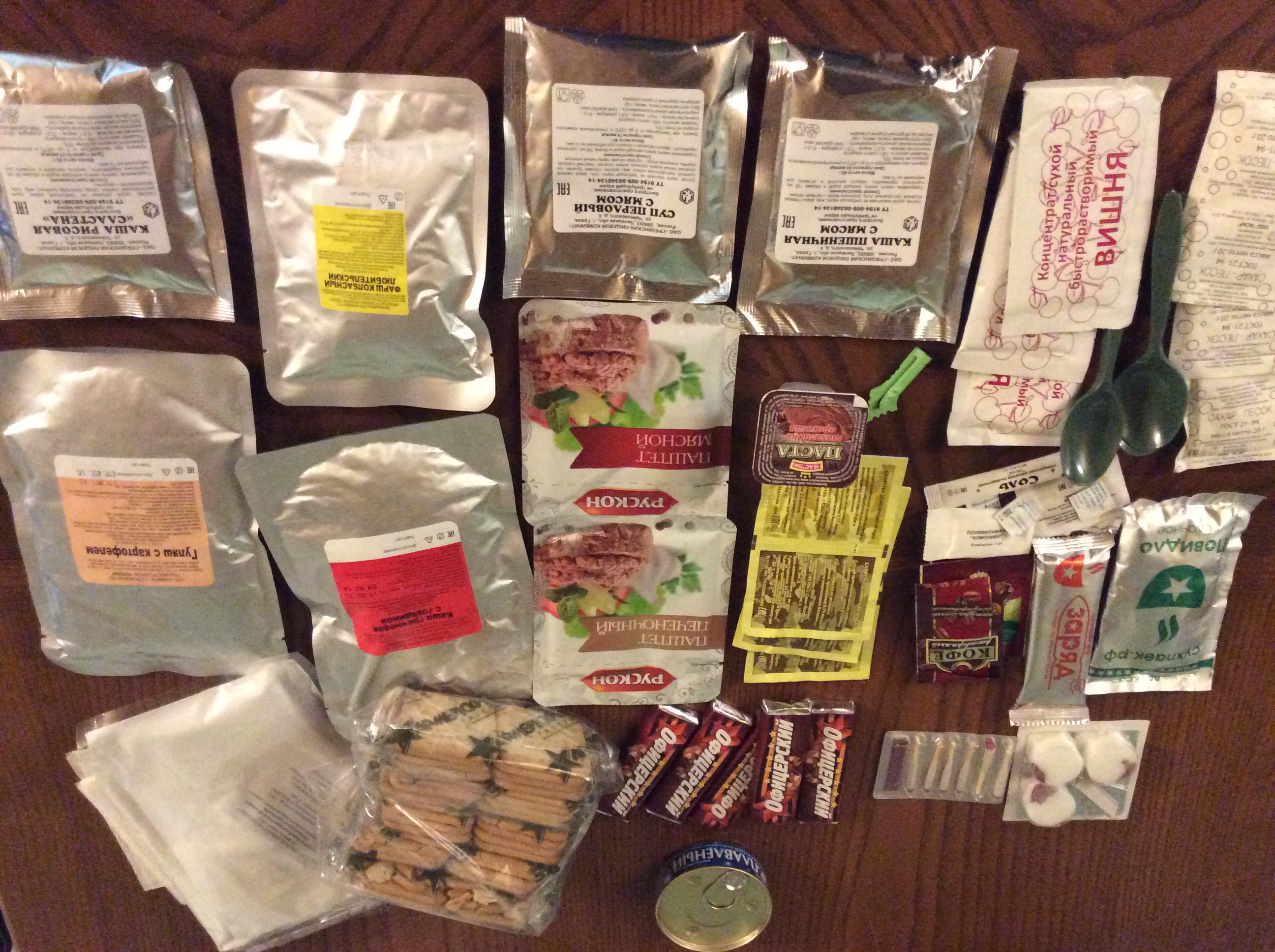 Greetings...This review is for the rare 24hr Russian mountain Ration that contains the retort pouched entrees instead of the tins. I'd like to thank onepamop for makin it available to the group. It also contains flameless ration heaters aswell as the fuel tab stove. The package was beat up in shipping, but only the crackers and chocolate spread were damaged. This ration has a ton of food for 1 person for 24hrs and weighs over a kilogram! Since there are 5 packs of crackers and 5 chocolate bars, I have divided it into 5 meals. Every soldier has his/her own routine when it comes to chow, so my meal selections are based on my own personal tastes.