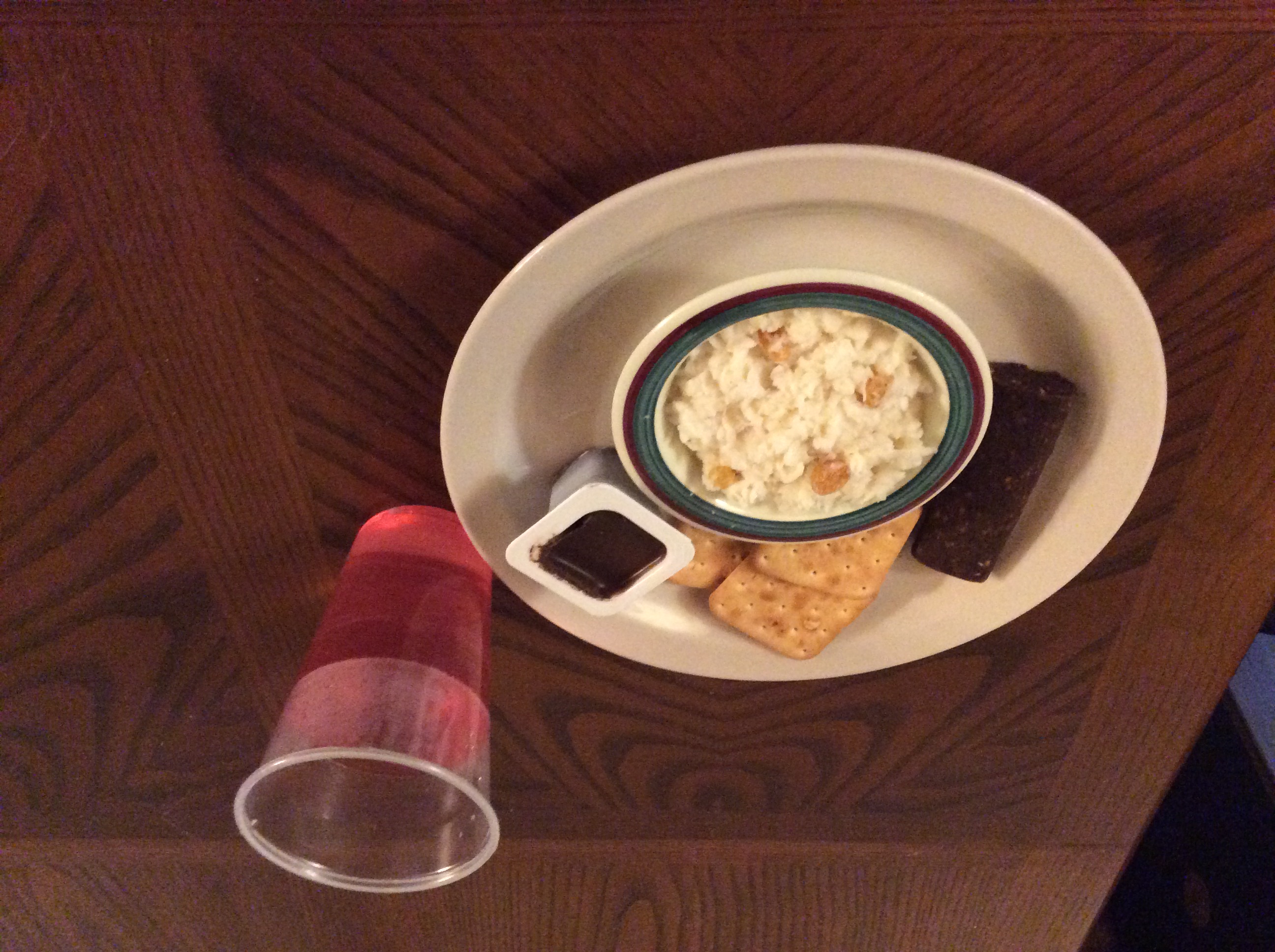 Meal 2 consisted of rice porridge with golden raisins, fruit and nut bar, chocolate hazelnut spread with crackers and cherry isotonic drink. The rice porridge was freeze dried and had a sweet/salty taste that was very good and it was very filling. The fruit and nut bar tasted like mostly prunes and nuts and had a texture and flavor that reminded me of a fruit roll up. Quite tasty. The chocolate hazelnut spread I took from another IRP for purposes of this review, as the one included was damaged in shipping. It is as you would expect, consistency of thick cake frosting and very sweet. Spread on the crackers, would definately satisfy any sweet tooth. The cherry drink had a very subtle cherry flavor but was mostly sweet.