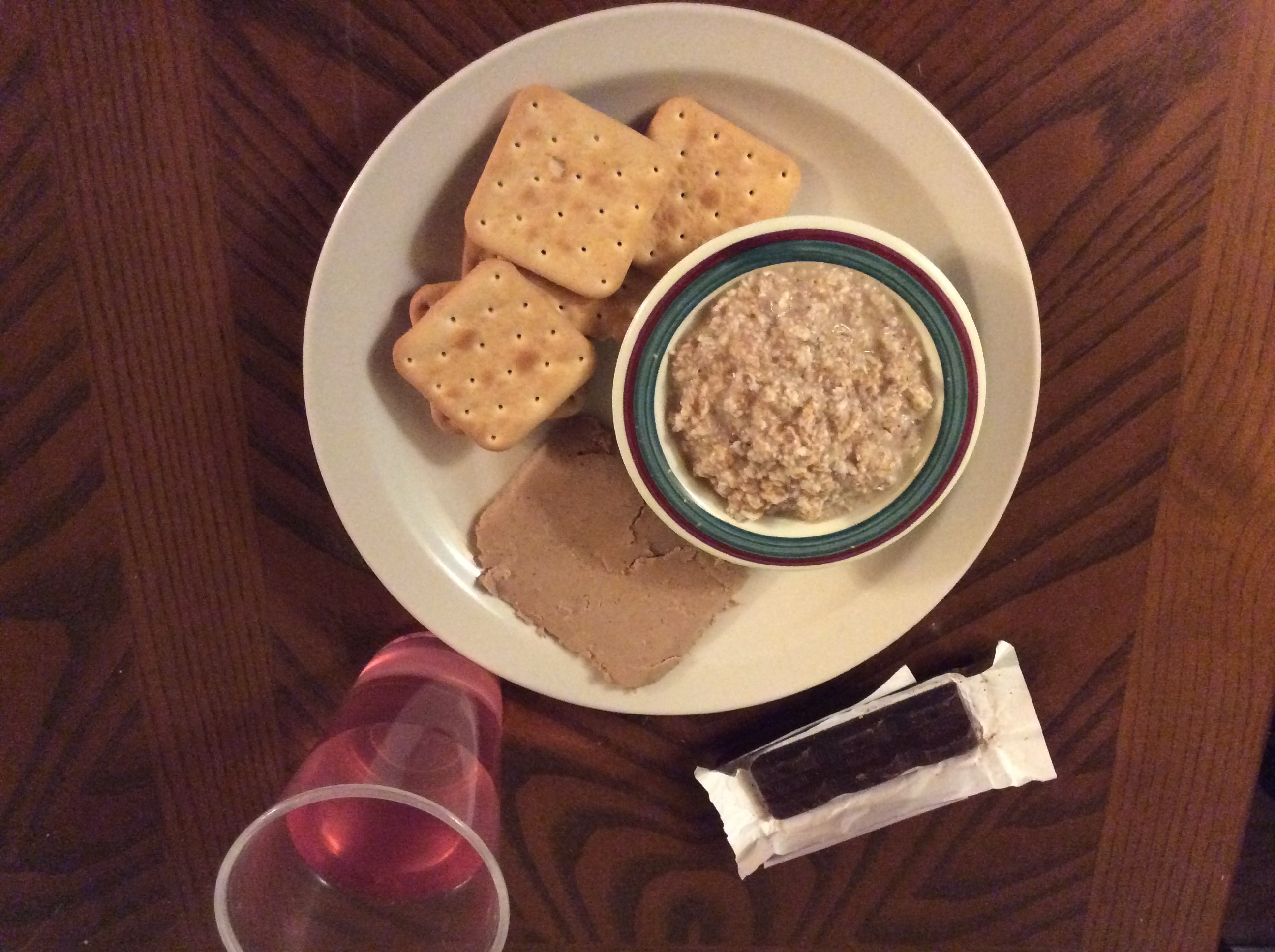 Meal 4 consisted of beef and wheat porridge, liver pate and crackers, cherry isotonic drink, and chocolate bar. The beef and wheat porridge has the consistency of oatmeal but a savory flavor of beef and onions; it is really good. The liver pate has a velvety smooth texture and rich bold flavor. It is excellent! Add a chocolate bar for dessert and cherry drink to wash it all down.