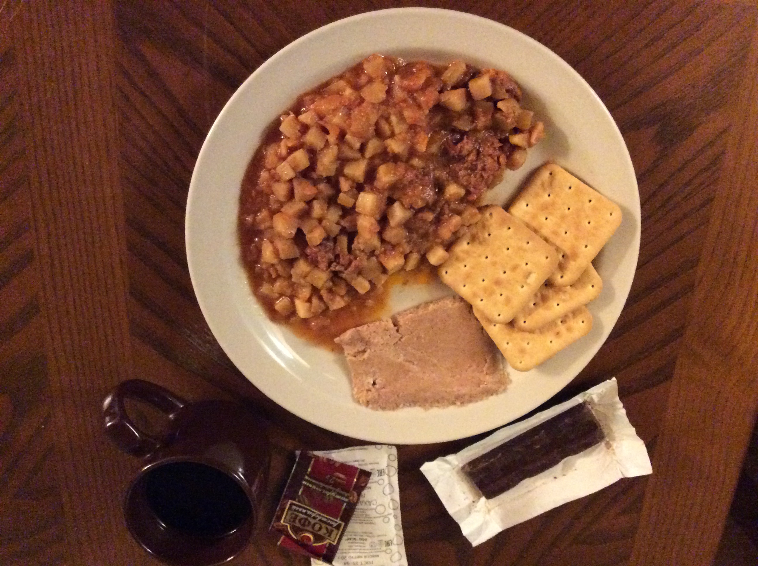 Meal 1 consisted of kasha(buckwheat and beef hash), apple butter and crackers, coffee with sugar, and a chocolate bar. Surprisingly, there's no creamer in this ration. The savory kasha and tangy sweet flavor of the apple butter were a perfect combo. Glad I matched these 2 together. The crackers were just ordinary rye, but went well with the meal. The kasha was very tasty, with an almost buttery savory background and the entree was huge. Didn't need any seasoning. The apple butter is delicious, it has a very natural flavor and texture.The coffee was ok, but nothing special. The dark chocolate bars in the IRPs have always been very good, this one was aswell. I thought the meal seemed a little small at first, but I was totally full when finished. Very hearty and satisfying meal to start the day.