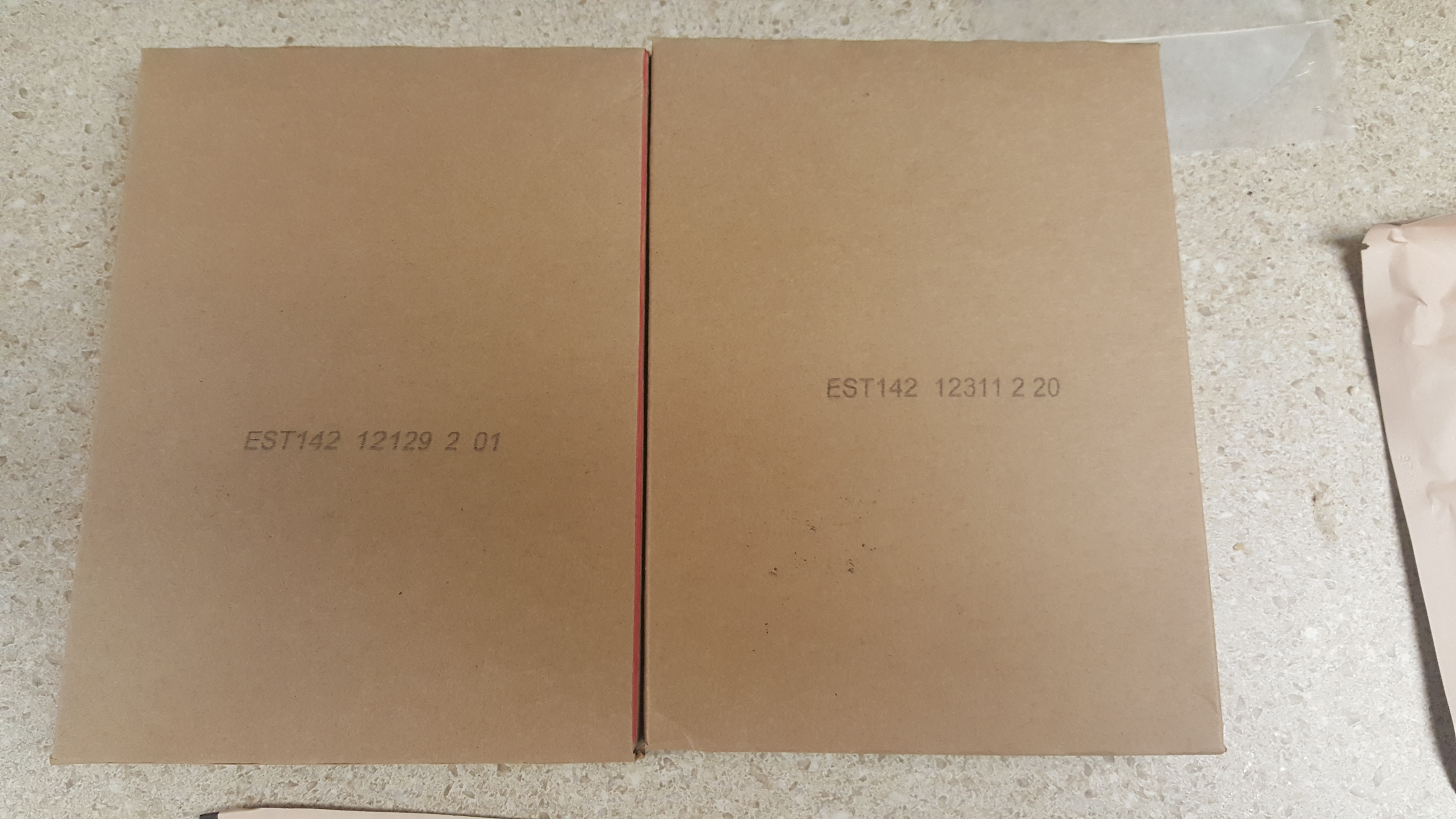 This is looking pretty solid so far! Here's a look at the cardboard sleeves and the entree's prior to being opened. I'm assuming the date would be on these.