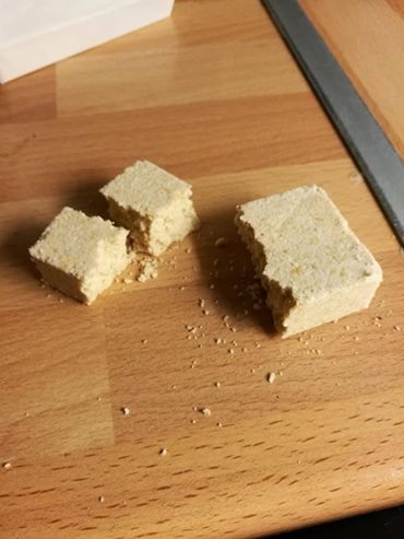In each pack there was 2 blocks, looks like a grainbar/cereal bar. Smells actually good, sweet wheat and grains. And it looks like the cacke blocks from the SP-63....