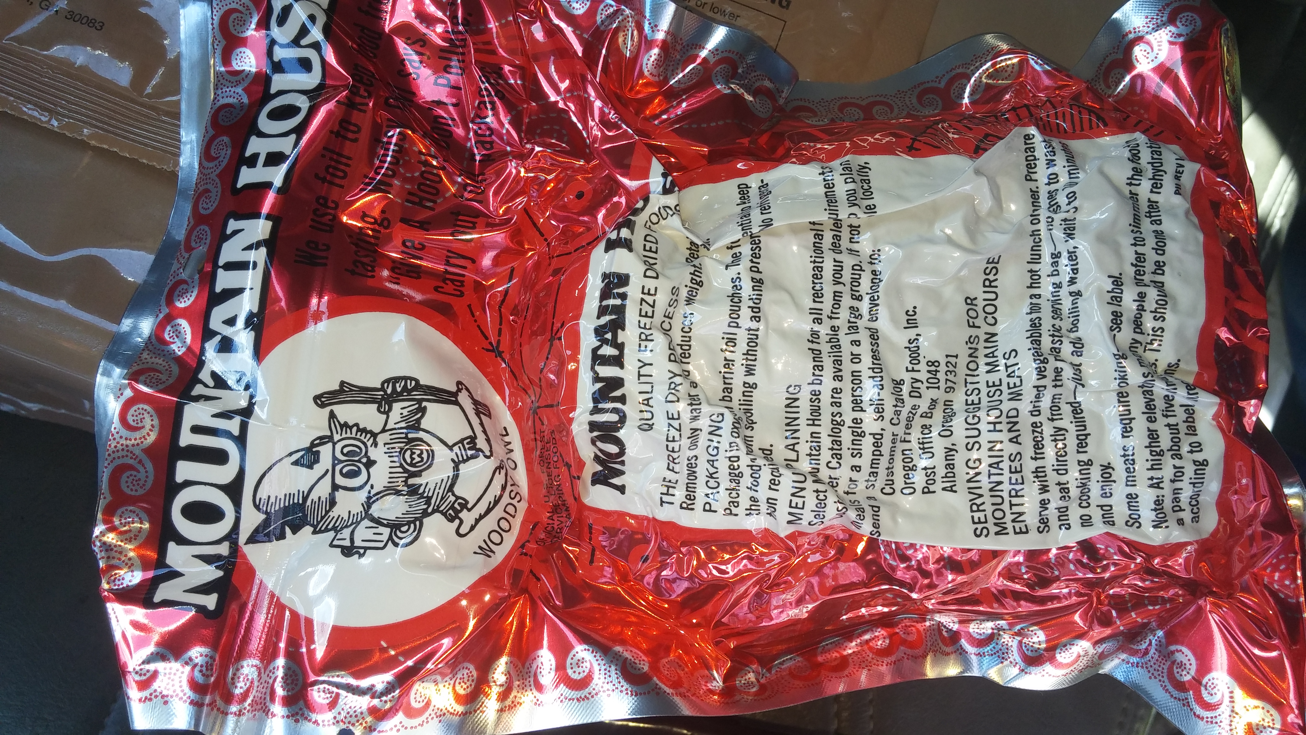 Here is the menu he sent to me. Vague bag about half the thickness of an MRE bag and with only a vague sticker with the main menu printed on it. Inside I found it to be a Mountain House FD meal with a main and an accessory pack. That answered the who made it portion but nothing else. The accessory pack was the real winner here I thought. Pilot crackers, Hershey's Tropical Bar, Orange Ade, Cocoa, Spoon ,Salt, Pepper, Napkin I had to look over every packet to finally find a date code that I am not 100% sure on how to read (11678). This was on the Orange packet. Now on to opening the stuff up.