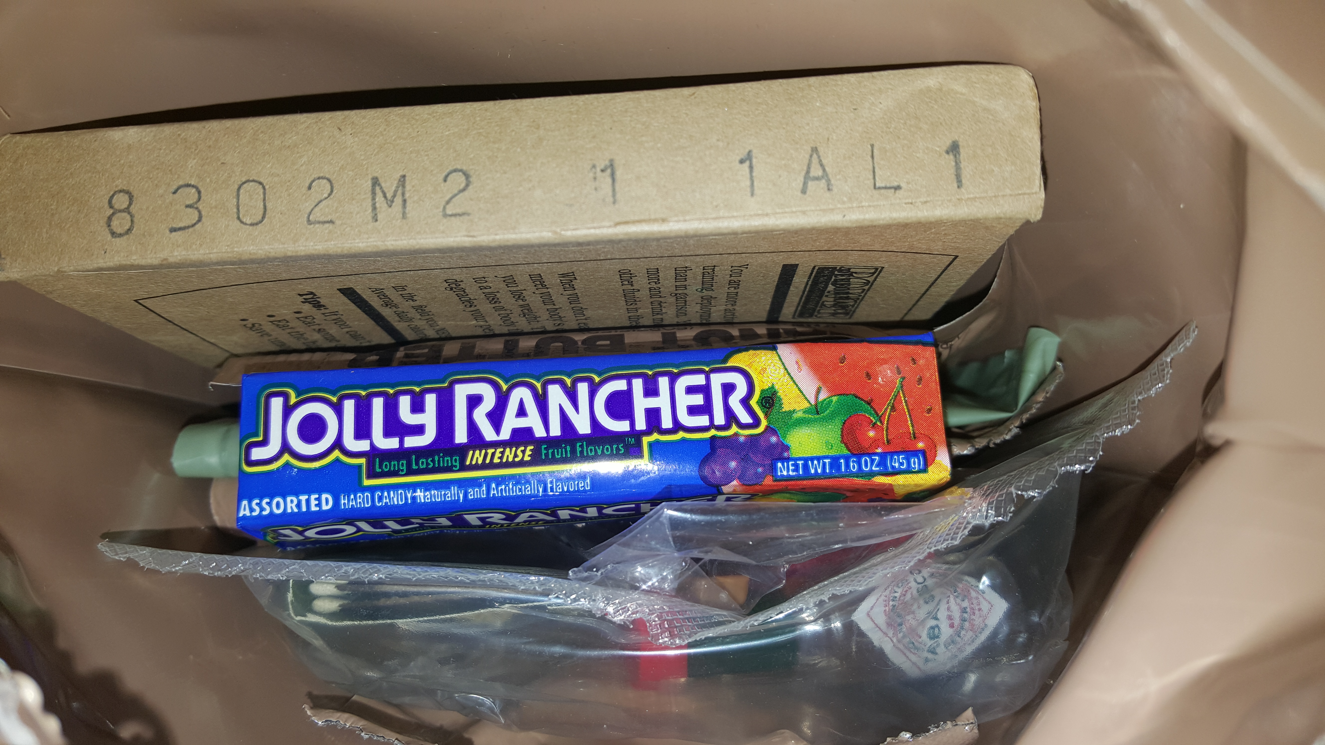 As we can see, the entree is dated 8302 so I was pretty excited to see this was a pre-2000 MRE! And it had Jolly Rancher candies in it. Score! I'll list off the contents in this ration:
