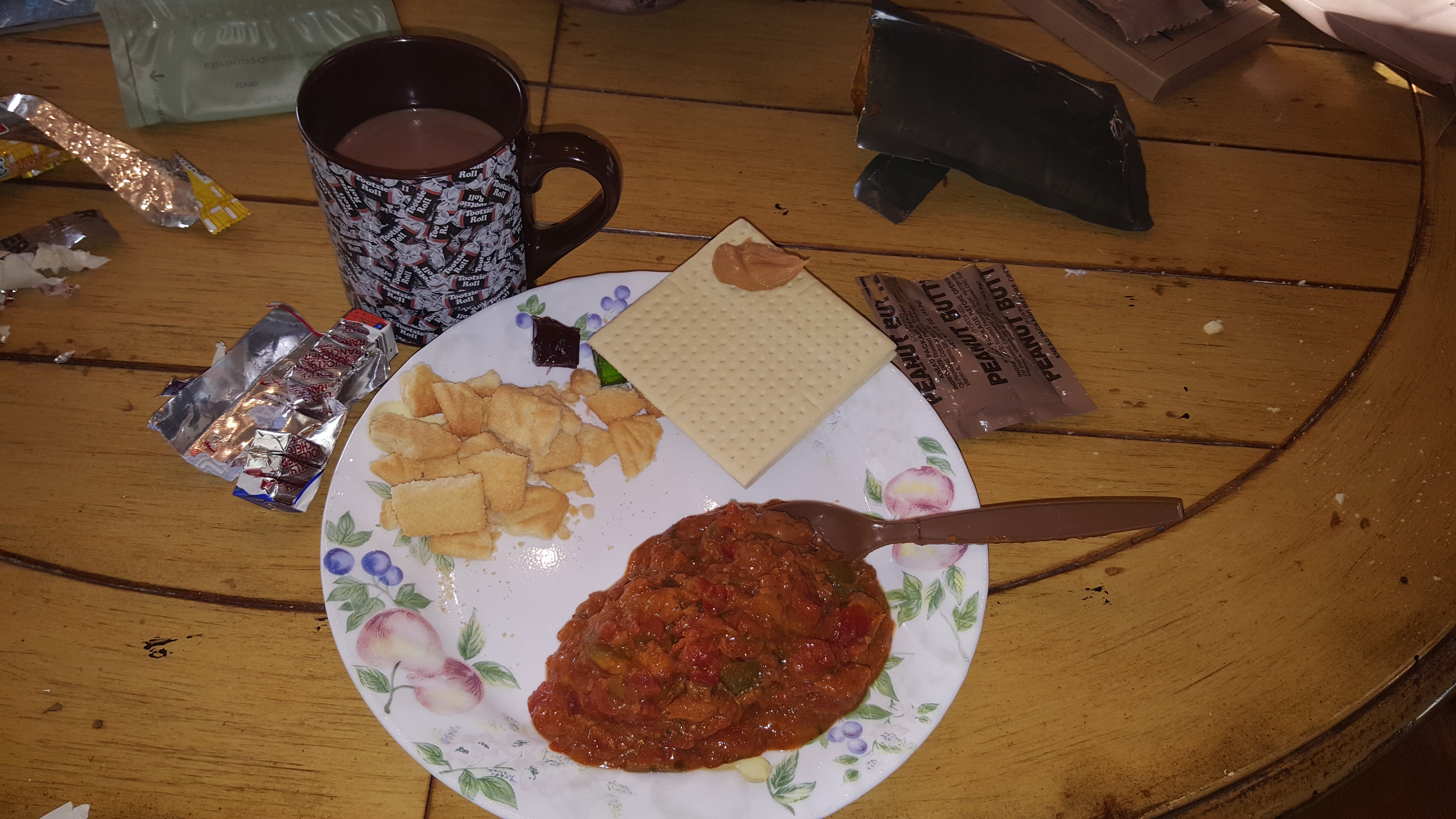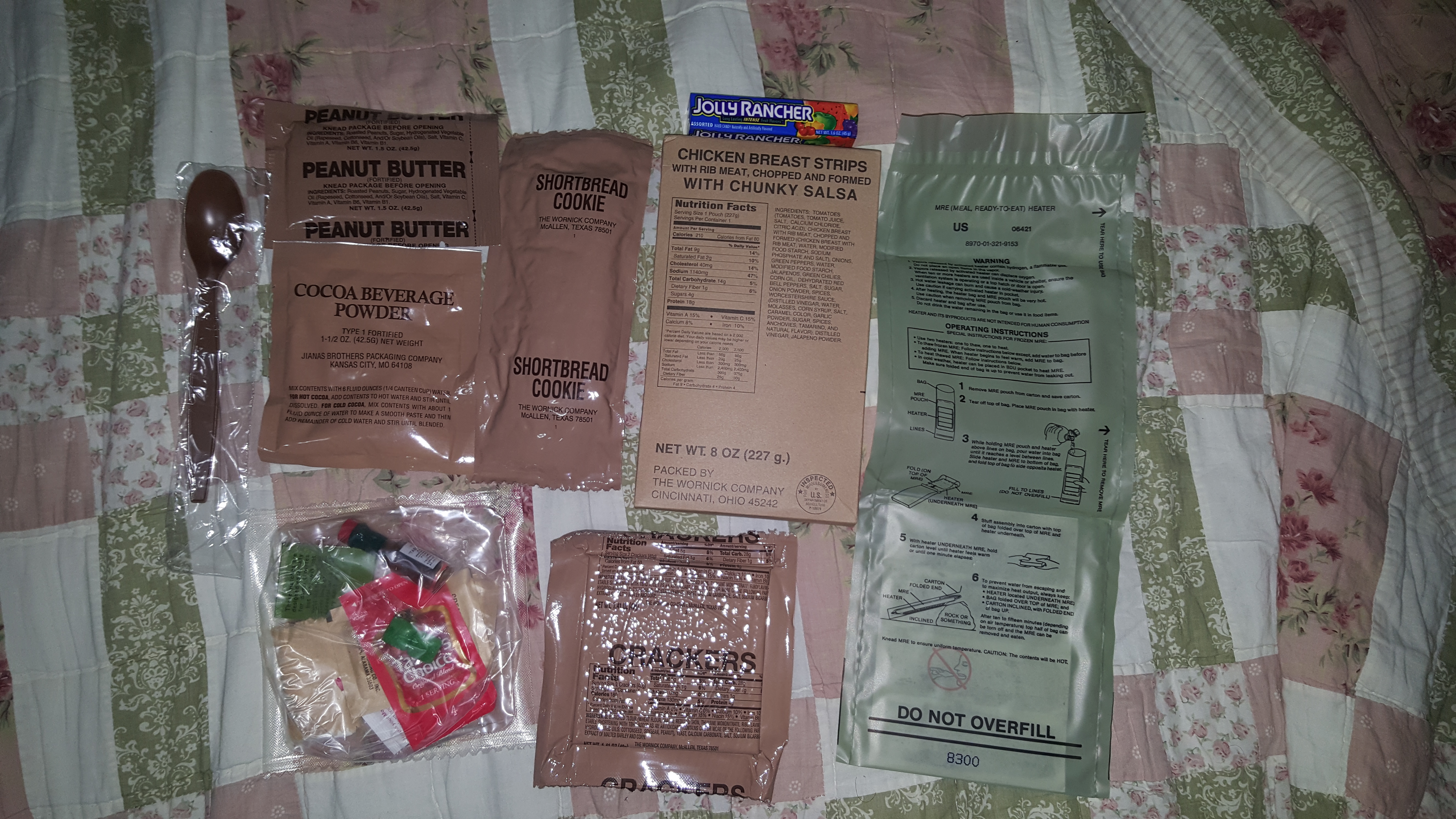 First off, the chicken salsa smelled amazing. As soon as I bit into a piece of it, it had that combination of immense sourness combined with bitterness. As one could probably imagine, it's not exactly akin to a nice steak dinner. So I ended passing on the remainder of that. But hey, we're not done yet! The Lorna Doone cookies tasted great! Heck, I'd say they taste better than brand new ones you can buy in the store today. I don't know if the cause of their great taste is aging or a recipe change. It had a slight vanilla taste and were enjoyable overall. The Jolly Rancher candies tasted great but they were stuck to the packaging so I struggled opening the little packs. As you can see in the above picture I only bothered to open two before I gave up. I did finish them off though. The crackers, peanut butter and cocoa were both good, as usual. I've yet to experience bad MRE crackers, peanut butter and/or cocoa. I even had those items in a C Ration a few weeks ago and even THAT tasted good! Explain your wizardry, food scientists! :shock: