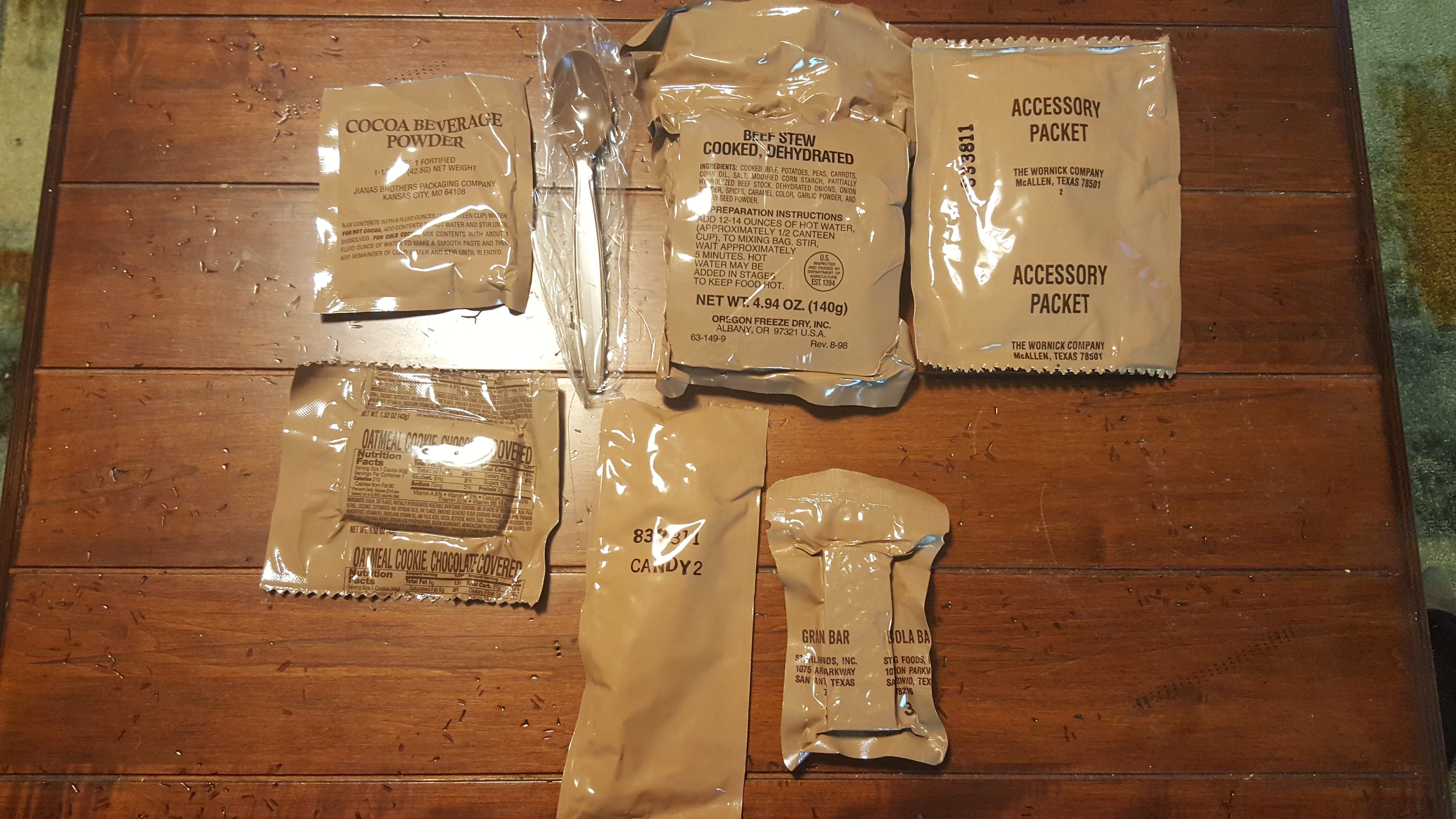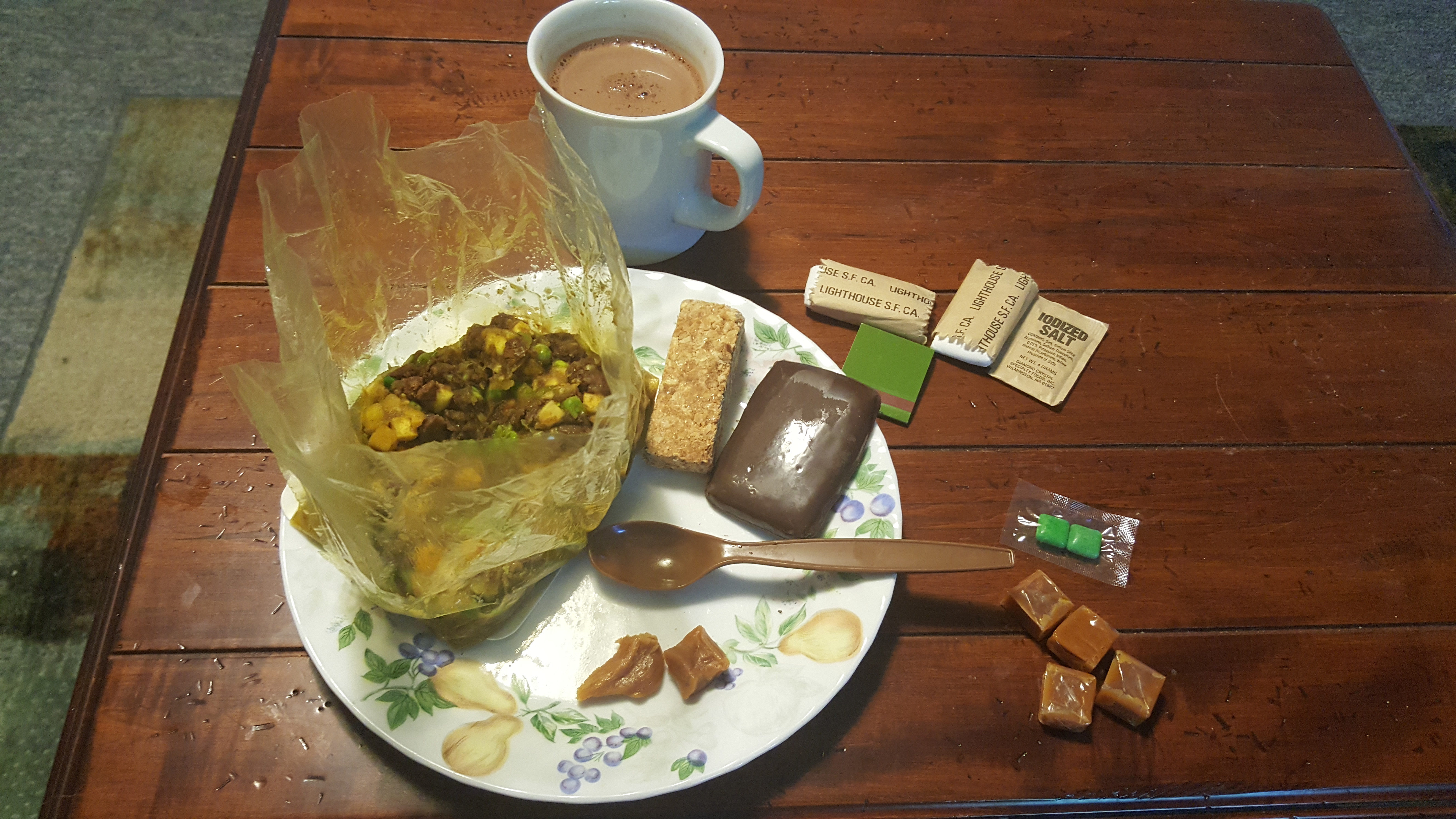 Oh, yes! What a treat this is going to be. At first sight the beef stew looked and smelled great, identical to a brand new package. I took a bite of it and made extra sure that nothing was off and it tasted fine! Nothing about it convinced me it's almost 20 years old. The granola bar was a tad bit on the stale side, but it was still okay. I decided to dip it into the mocha I prepared and that didn't do it much justice I'm afraid. Oh well, I still finished it off. The chocolate oatmeal bar is always a sight to behold in a ration, and as anyone would expect, it tasted great. The caramels had a bit of an aged taste and were hard to open from their individual packs, but they still tasted okay. They were not as sour as the ones you'd find in an 80's MRE. I suspect that if this LRP were to sit around for another 10 years, the caramels would begin to taste pretty sour. I decided to mix the coffee, creamer and sugar with the cocoa to make a mocha, as suggested earlier. The taster's choice coffee had gone bad so I replaced it with some Diario coffee from a 2012 LRP accessory packet I had laying around. I finished everything off with the gum and stored the matches, toilet paper and salt away for later use. What a great lunch!