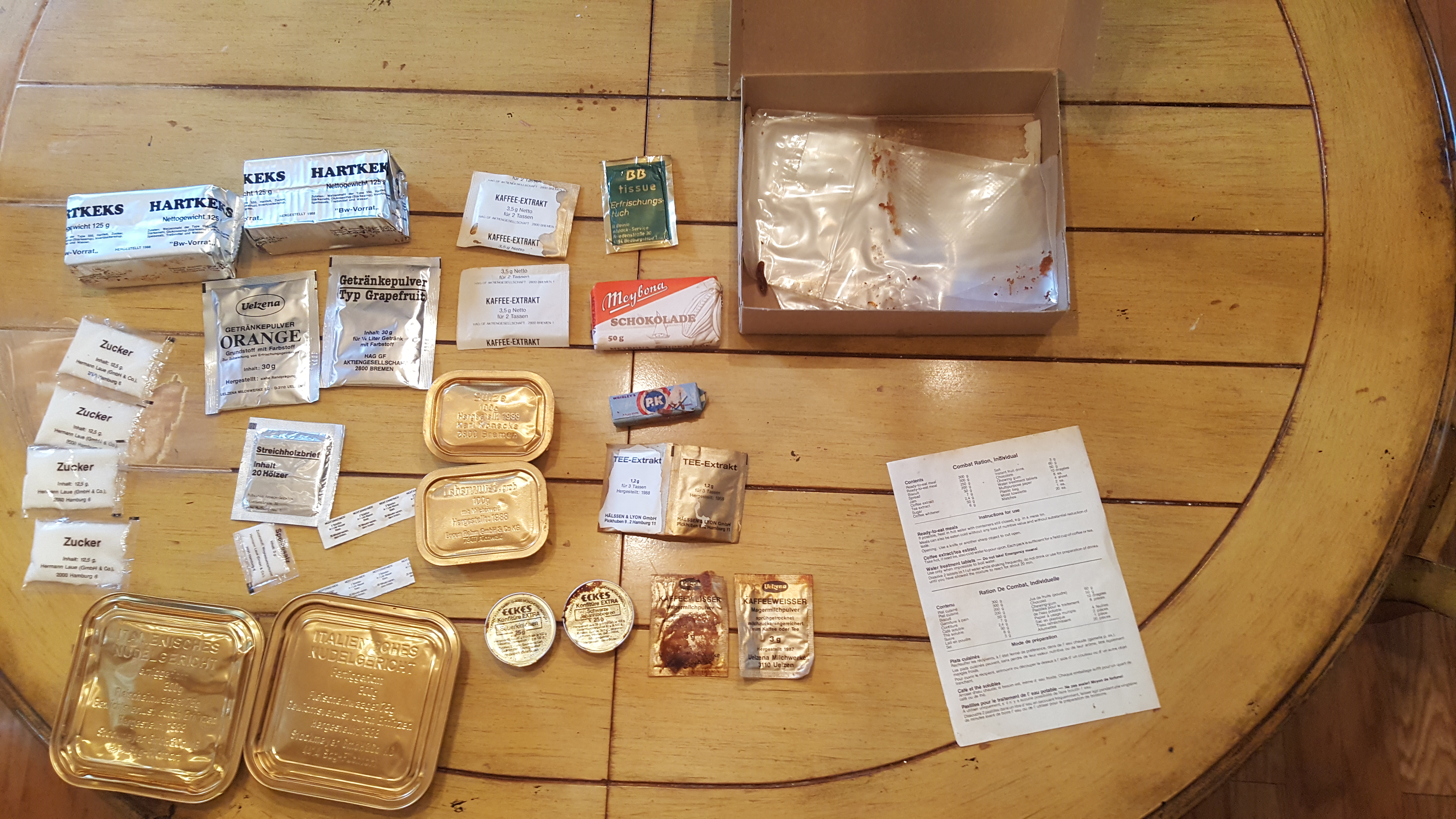 The coffee was still good. It's very reminiscent of the type I coffee from the 1980s MREs, so naturally it tasted fine. The creamer left much to be desired as it had solidified over time. So it was just coffee and sugar for me. I still haven't had the tea but I felt the packaging and it felt okay. I may try it at a later date. The fruit drinks were both very enjoyable and sour! I've heard Germans like sour food and drinks so that wasn't much of a surprise to me.