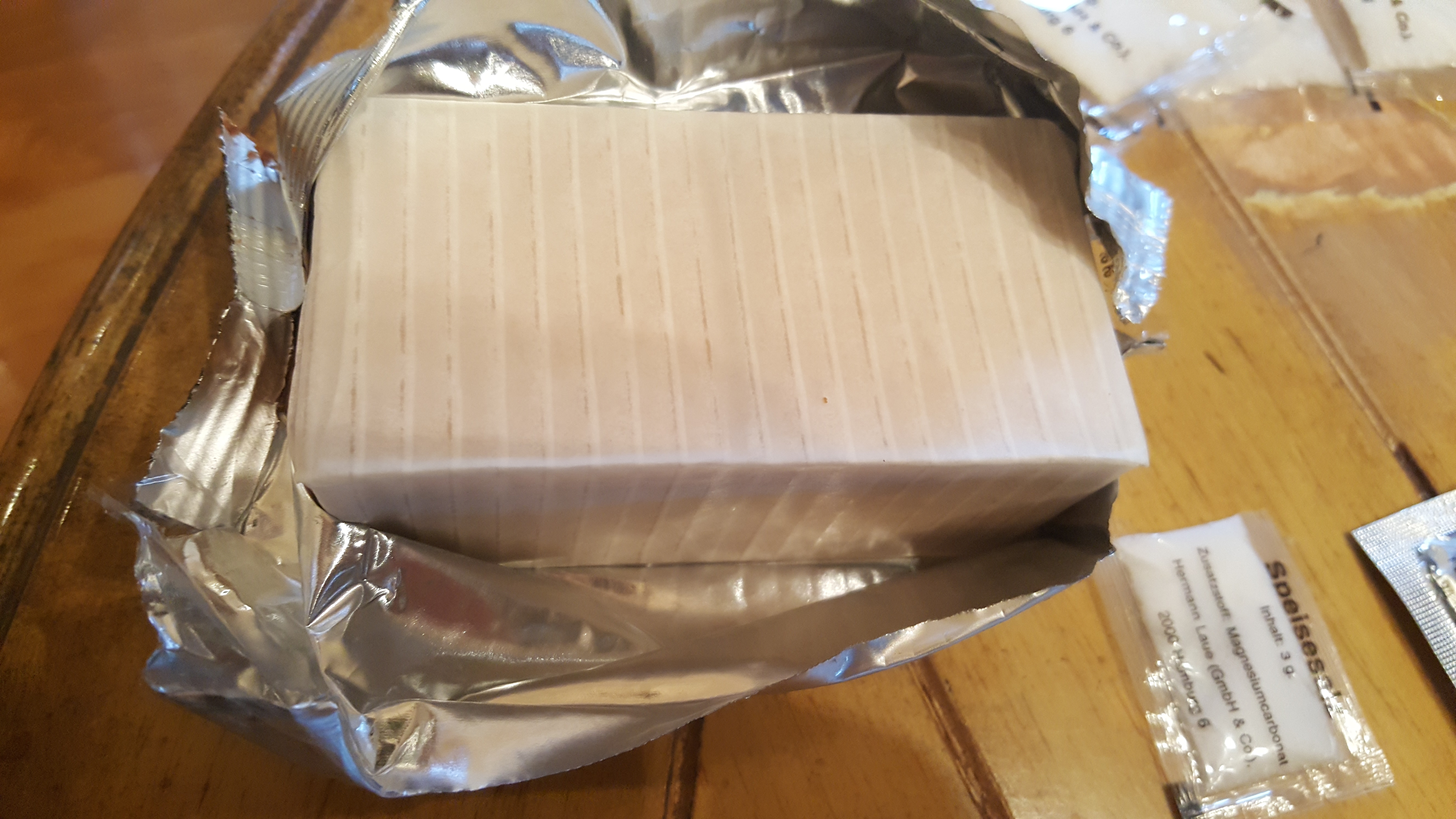 The coffee was still good. It's very reminiscent of the type I coffee from the 1980s MREs, so naturally it tasted fine. The creamer left much to be desired as it had solidified over time. So it was just coffee and sugar for me. I still haven't had the tea but I felt the packaging and it felt okay. I may try it at a later date. The fruit drinks were both very enjoyable and sour! I've heard Germans like sour food and drinks so that wasn't much of a surprise to me.