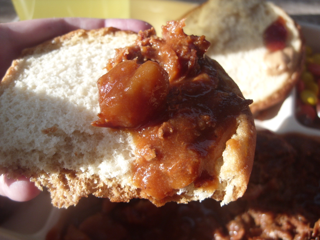 The hamburger bun wasn't half-bad, really similar to regular stale bread. IMHO, way better than the wheat snack bread (but I had that only once so far and I was damn hungry so it doesn't count) - I'll have to slice the next one in half for a more valid comparison. Together with that peanut butter though, it makes your mouth go instantly dry just the same. But. It was just made to soak in that BBQ sauce from pork. Really, it makes all the difference.