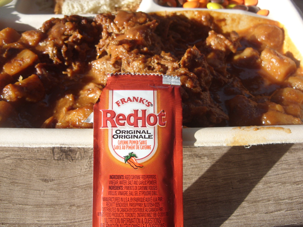 ). The pork was easily splittable with a spoon, had that drier outside that makes you think of a roast, not mouth-melting but better than my mom's roast in that matter. The potatoes were nice and soft, balancing out the sauce. Tried adding some hot sauce but it didn't help much.