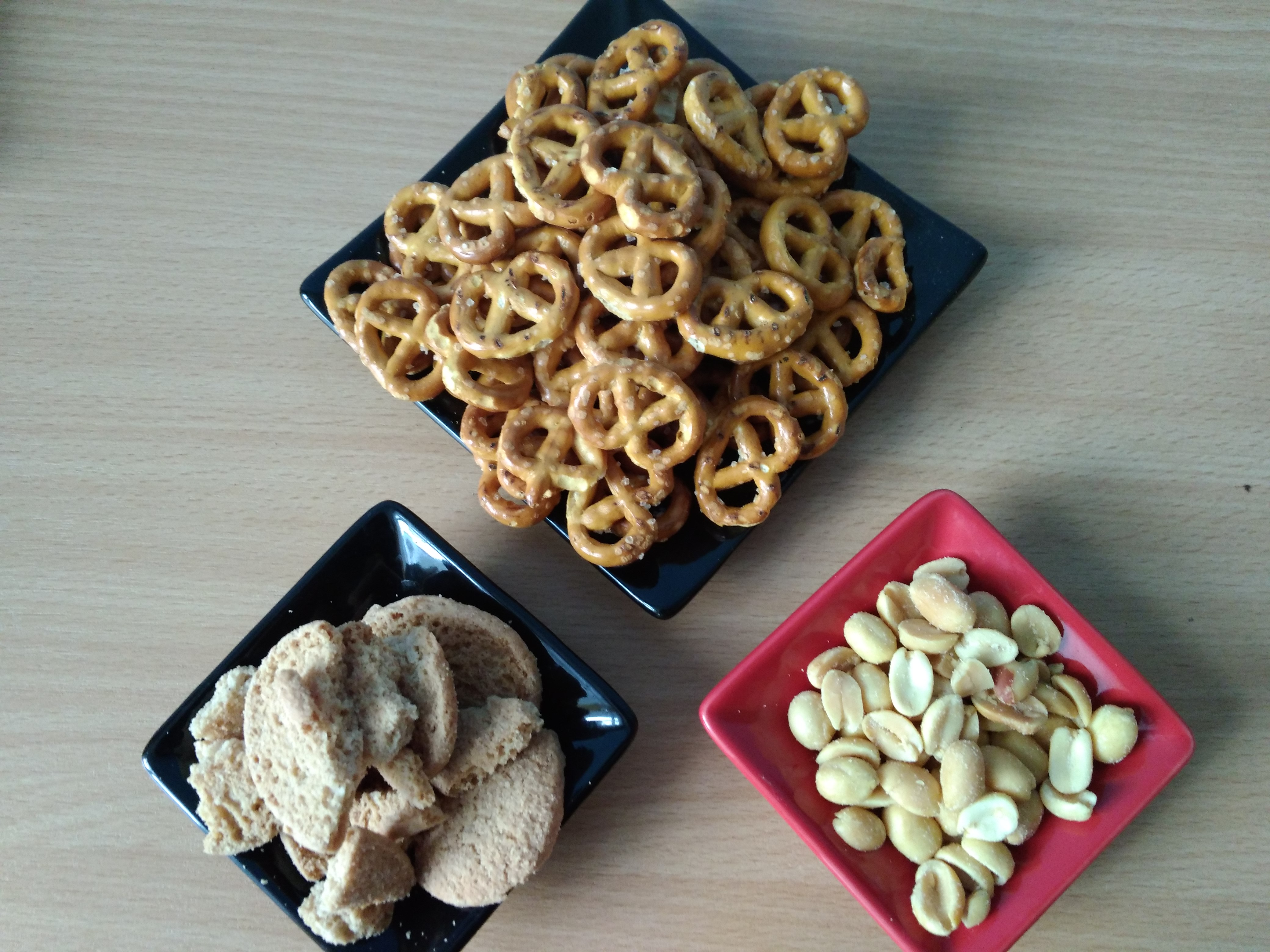 With the printed BB date of March 2017, I was curious how they held up - but they did pass the test. Both mini pretzels and the peanuts lightly salted and still pleasantly crunchy (okay, the peanuts were not as crunchy as you get them from the just opened can; but they're still fresher than if I left a super fresh portion on my desk). And the ginger snap cookies... Mmm... crunchy, super gingery (mostly in smell), and going real good with the pudding.