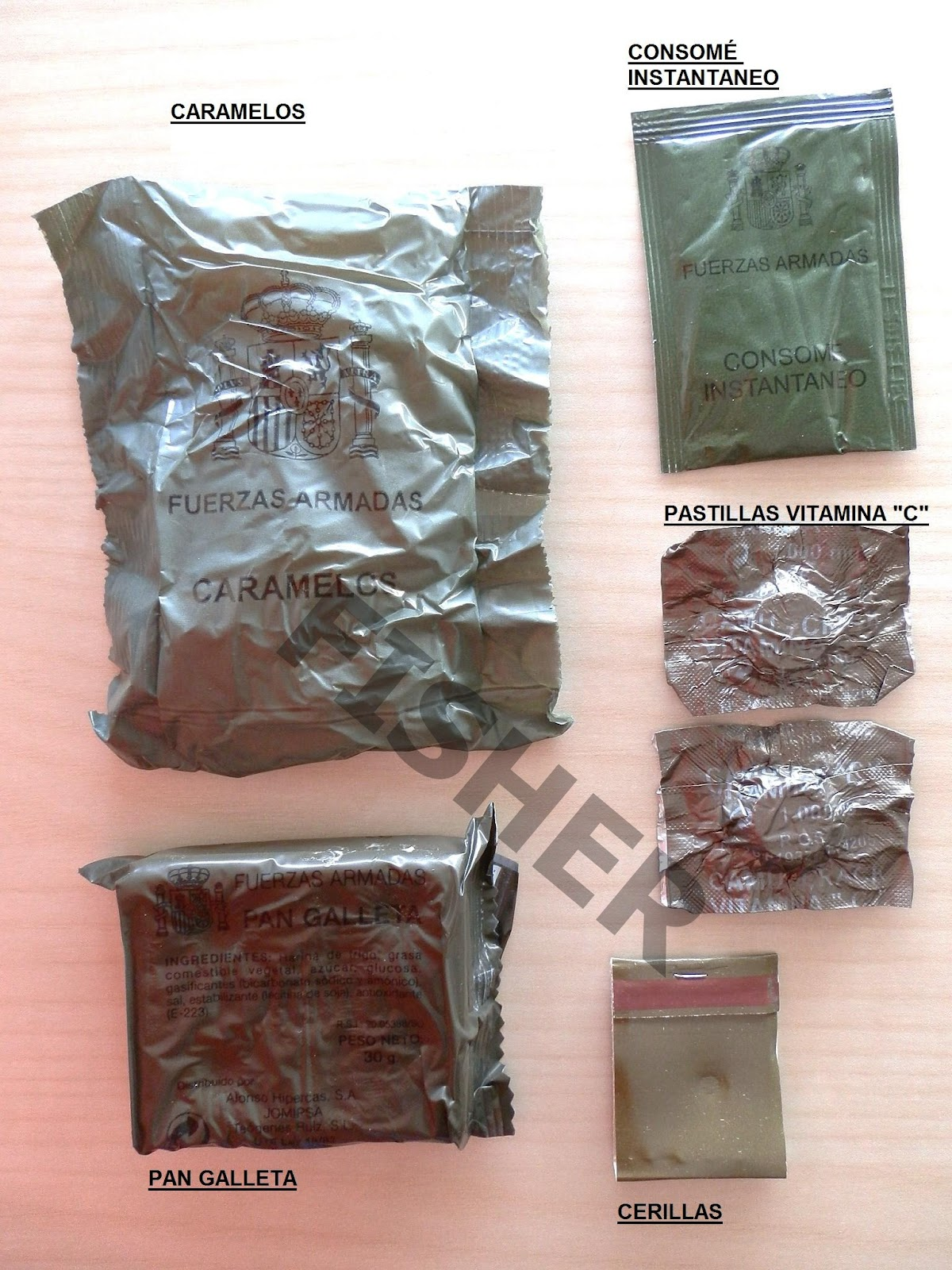 the contentshigh energy balanced nutrient bars, hidrating tablets, ''turron'' (typical spanish food), chocolate bars, dried meat bars coffe, sugar, fuel tablest and water purification tablets