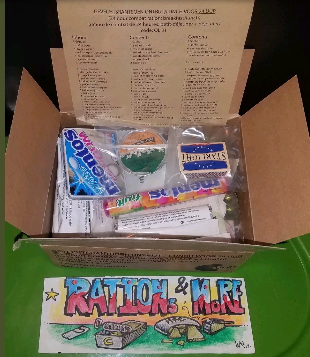 HAVE A 2010/2011 VINTAGE DUTCH RATION (24HR B+L IN THE BOX). THIS VERSION PREDATES THE 24HR B+L BAG RATION, WHICH PREDATES THE CURRENT BASE MODULE VERSION. THIS IS A BRAND NEW AND WELL STORED RATION I JUST OPENED TO TAKE PICS TO SHOW. DEFINITELY A COOL COLLECTIBLE FOR THE HARDCORE RATION HEAD, OR FOR REVIEWERS TO SHOW SOMETHING COOL. I HAD 3 OF THESE, AND ONLY HAVE 2 LEFT (1 WHICH I AM KEEPING MYSELF OF COURSE!! LOL). AS WITH ALL DUTCH RATIONS, THE MAIN ENTREES WERE NOT INCLUDED IN THE PACK, AND WERE GIVEN SEPERATELY(THIS SALE DOES NOT INCLUDE ANY MAINS), WHICH DURING THIS TIME PERIOD, WAS 2 GOLD COLOR TINS(SAME STYLE AS FRENCH MAINS). THIS WAS DONE ALSO IN THE NEXT "BAG" VERSION OF THE RATION, WHEN RETORT POUCHES STARTED BEING USED AND THEN WERE ADDED INTO THE RATIONS, (EVEN THOUGH THEY STILL CAME SEPERATELY). CURRENT RATIONS HAVE DISCONTINUED USE OF THE TINS AS FAR AS I AM AWARE, AS I HAVENT SEEN ANY NEW TIN PACK DATE ONES AFTER 2016.(FEEL FREE TO CORRECT ME IF I AM MISTAKEN). THIS ALSO CONTAINS SOME ITEMS NOT IN CURRENT RATIONS ANYMORE SUCH AS THE CHOCOLATE BAR, SOME PATE TYPES, ETC.