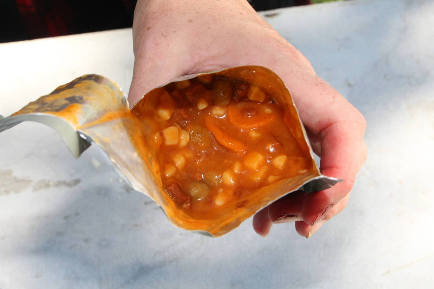 The beef stew entree tasted as good as any commercially canned stew. It reminded me a lot of Dinty Moore. You can clearly see individual pieces of veggies and meat when you open it and serve it. MREs are designed so that you can eat them right out of the pouch, but we poured our entrees onto plates for the purpose of this comparison article.